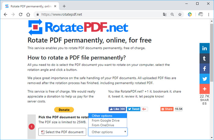 首頁線上工具文書編輯 RotatePDF 線上旋轉 PDF 檔案的免費網路服務 有些 PDF 閱讀器有內建頁面旋轉的功能,但無法儲存設定值,造成每次開啟還是要手動再來一次,相當麻煩,RotatePDF 是一個線上旋轉 PDF 檔案的免費網路服務,提供頁面可轉 90、180 及逆時針旋轉 90度的功能,只要選好檔案,旋轉角度,上傳即可完成,操作相當簡單。 🔔 不錯過任何精彩! 立即訂閱我們的 LINE 官方帳號 每次發佈新文章時,您將會第一時間收到本站文章連結通知,輕鬆掌握最新資訊! 使用 LINE 追蹤文章更新 §相關文章,還可以參閱:DeckEdit:NotebookLM 簡報救星!PDF 轉 PPTX 零失真編輯章快圖:免費線上 PDF 騎縫章蓋章工具,安全快速OakPdf:模擬掃描器效果的 PDF 文件處理工具,輕鬆打造掃描質感線上文字內容差異比較工具:Little Differ 透過顏色標示快速找出不同之處免費 AI 句子產生器:AI Sentence Generator 讓 AI 根據指令以不同語氣創作或改寫句子,中文可 如何使用 RotatePDF ? 1.使用瀏覽器進入 RotatePDF 網站,首先,按[ Select the PDF document ]來選擇要轉角度的 PDF 檔案,在 Other options 可選擇檔案的來源。 2.選擇頁面要旋轉的角度。 3.最後,按[ Rotate PDF ]開始上傳,稍後,便可下載或將文件儲存到雲端硬碟。 RotatePDF網站網址:https://www.rotatepdf.net/