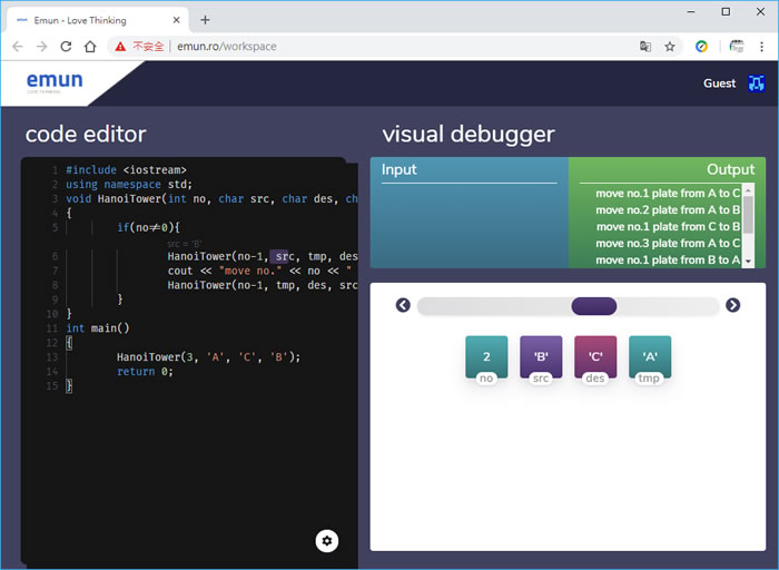 首頁線上工具開發工具 emnu 步驟可視化的線上 C++ 編譯器 「程式設計」已被明訂在十二年國教課綱的科技領域內,成為必修課程,其學習內容分為「演算法」、「程式設計」、「系統平台」、「資料表示、處理及分析」、「資訊科技應用」以及「資訊科技與人類社會」等六大面向,而在程式設計這塊,光是程式語言就有相當多種,但屹立不搖的大概就只有 C、C++、JAVA,網頁用的 PHP、JavaScript 等這幾種,但一法通、萬法通,不論程式語言出多少種,只要扎扎實實學好一種,其他的大概也能通個5、6成,剩下的就是各個語言上的限制了,想要學程式設計,看別人的程式碼相當有用,如果能自己實作更能融會貫通,emnu 是個免費的線上 C++ 編譯器,非常適合初學者及需要有步驟值的程式碼來這裡執行,例如寫了個迴圈,想要看迴圈內各變數的變化,emnu 就能幫你輕鬆實現,免去逐步 trace 過程。 🔔 不錯過任何精彩! 立即訂閱我們的 LINE 官方帳號 每次發佈新文章時,您將會第一時間收到本站文章連結通知,輕鬆掌握最新資訊! 使用 LINE 追蹤文章更新 §相關文章,還可以參閱:網站效能健檢免費工具!PageTest 多裝置模擬效能分析及由 AI 提出改進建議Regex-Vis 圖解正則表達式的線上工具,可編寫還可驗證Sitemap Generator:線上快速產生符合 SEO 標準的網站地圖,無網址數量限制適用各類型網站網站隱私權政策產生器 Privacy Policy Generator:輸入網站名稱和網址即可輕鬆生成專屬條款Frame0:輕鬆繪製應用程式流程圖、UML 和介面雛形的免費工具,適用於 macOS 與 Windows 如何使用 emnu ? 1.使用瀏覽器進入 emnu 網站,就可以看到範例程式,輸入、輸出框及其下方的步驟條。 2.例如寫個簡單的1+2+3+.....+100的 for 迴圈,我們就可以利用步驟調來觀察程式中變數的變化。 3.又例如河內塔,遞迴必用的經典範例,我們就可以很輕鬆知道盤子如何在每根柱子之間移動,而不會只有出現結果。 emnu網站網址:http://emun.ro/workspace