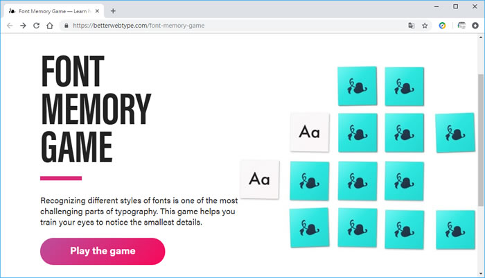 首頁線上工具益智遊戲 Font Memory Game 英文相似字體記憶遊戲 在一個排列整齊的紙盤中,找出曾翻開過的相同圖案,如果不同,紙牌就會再翻回去,玩家必須記住花色的位置,下次如果有翻到記憶中花色的位置,就可以配對,配對成功,就可將該對移除,所以一開始這種相似圖案配對遊戲會有困難度,後面隨紙牌數的減少,配對的速度也會加快,此類的記憶翻牌遊戲相當好玩,牌面可以是人物、動物、植物...等等,Font Memory Game 也屬於此類的網頁遊戲,不同的是其花色採用英文字體,leval 1 採用 10 種變化的 a 字體,且大寫的 A不變,而變化小寫的 a,leval 2 則有 14 種變化的A 與 a 字體,有點挑戰,大家加油。 🔔 不錯過任何精彩! 立即訂閱我們的 LINE 官方帳號 每次發佈新文章時,您將會第一時間收到本站文章連結通知,輕鬆掌握最新資訊! 使用 LINE 追蹤文章更新 §相關文章,還可以參閱:Google Doodle 萬聖節遊戲登場!小精靈 45 週年特別版完整介紹毫秒級反應力大挑戰!用 Reaxon 訓練大腦、眼睛與手的協調反應2048 Cupcakes 經典單人 2048 滑塊線上遊戲,AI 輔助輕鬆挑戰高分免費線上拼圖遊戲平台:iLoveJigsaw 可自行上傳圖片製作拼圖Songlio:線上聽音樂猜歌曲名稱遊戲,可自訂歌曲題庫並與多人一起挑戰 如何玩 Font Memory Game 網頁遊戲? 1.使用瀏覽器進入 Font Memory Game 網站,就可以點擊[ Play the game ]開始挑戰。 2.點擊牌面就可以翻開看花色,同樣都是小寫的 a,但字體不同,需特別注意,一開始不容易,隨這記憶就可以加快配對的過程。 3.完成後,會有翻牌次數及時間統計,第一關需要在 25次及 2分鐘內才能晉級。 Font Memory Game網站網址:https://betterwebtype.com/font-memory-game