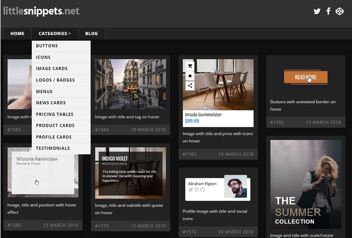 首頁線上工具生產力工具 littlesnippets.net 免費取得 CSS、JavaScript 動畫效果程式碼 寫網頁時難免會有需要一些動畫效果,例如當滑鼠指標在按鈕、圖片、功能表上或離開時,或是希望做出具有專業水準個人檔案、新聞、產品卡時,如果是初學者想要從無到有,可能需要花費較長時間,要是可以參考別人已做出的效果,取得其程式碼再來修改成自己想要的效果,這樣才能事半功倍。littlesnippets 這個網站提供按鈕、圖片、Logo、News Card、Menu、Profile Card ....等各式各樣的 CSS + JQuery 效果,且每個都有效果展示,更提供 HTML、CSS、JQuery 完整的範例程式碼,用戶只需取得這些程式碼,稍加修改,就可以在自己網頁呈現,相當方便。 🔔 不錯過任何精彩! 立即訂閱我們的 LINE 官方帳號 每次發佈新文章時,您將會第一時間收到本站文章連結通知,輕鬆掌握最新資訊! 使用 LINE 追蹤文章更新 §相關文章,還可以參閱:OpenAI 在 ChatGPT 中測試廣告|哪些帳戶受影響、廣告運作原則一次看在蝦皮當賣家,商品如何定價?手續費、免運、稅金怎麼算?蝦皮手續費計算機幫你全搞定!Google AI Plus 降到 260 元對決 ChatGPT Go!誰的功能更值得訂閱?ChatGPT Go 月付 290 元值得嗎?免費版、Plus 完整比較用 AI 做出的電影,YouTube 就看得到!一起來欣賞這部贏得百萬美元的突尼西亞短片《Lily》 如何使用 littlesnippets.net 範例程式碼? 1.使用瀏覽器進入 littlesnippets.net 網站,在 CATEGORIES 處,便可取得所有分類。 2.頁面上的每個範例都有展示其效果。 3.可以點擊進入,取得該項更細節的展示與程式碼,如果需要應用十,可將 HTML、CSS 及 JavaScript 程式碼放到網頁適當處,便可做出相同效果。 littlesnippets.net網站網址:https://www.littlesnippets.net/