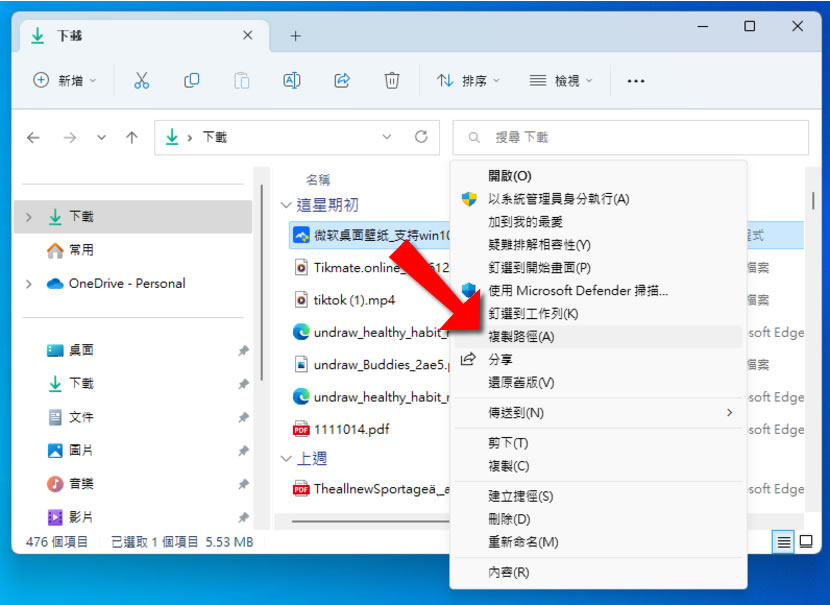 首頁操作技巧Windows [ Windows ] 如何利用鍵盤快速鍵複製檔案完整路徑? 當要取得 Windows 資料夾或檔案完整路徑時,很多人可能會想到利用滑鼠右鍵點擊後,再去複製[ 內容 ]內的位置屬型,但這樣的操作,只會取出路徑,卻沒有檔案或資料夾的名稱,自己還要額外補上,當然,也有很多輔助的應用程式,可以協助取得 檔案完整路徑,如果都嫌麻煩,也可以利用 Windows 內建的快速鍵來取得,但取出的路徑前後會有 " " 雙引號包夾,多數要應用時,還是要將其去掉。 🔔 不錯過任何精彩! 立即訂閱我們的 LINE 官方帳號 每次發佈新文章時,您將會第一時間收到本站文章連結通知,輕鬆掌握最新資訊! 使用 LINE 追蹤文章更新 §相關文章,還可以參閱:你的 Windows 筆電是真睡還是裝睡?一個設定終結背包發熱耗電學起來!微軟親授 10 個提升 Windows PC 效能的技巧如何升級 Windows 11 25H2?最新版本功能亮點與完整更新步驟Windows 工作列時鐘顯示秒數:真的會影響電池續航力嗎?LTT Labs 完整實測解析Windows 快速取出資料夾檔案名稱清單!內建功能輕鬆搞定,不用額外軟體 [ Windows ]如何使用內建快速鍵快速複製檔案完整路徑? 1.在資料夾或檔案處,利用滑鼠右鍵點擊後,會有快速功能表出現,但不會有[ 複製路徑 ]的功能。 2.如果相同的動作,同時加上鍵盤的 shift 鍵,就會有不一樣的快速功能表出現。 3.取得的路徑會有資料夾名稱,如果是檔案還會包含副檔名。 4.前述是在 Windows 10 的操作方式,在 Windows 11則就簡單許多,只要滑鼠右鍵點擊檔案叫出快速功能表,再按[ 顯示其他選項 ]後,就可看到[ 複製路徑選項 ]。 5.其他選項的功能表中就會有[ 複製路徑 ]的按鈕。