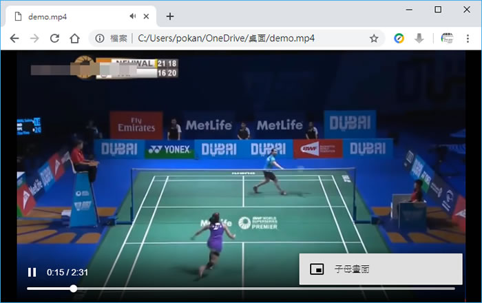 首頁操作技巧瀏覽器 如何使用 Chrome 瀏覽器子母畫面模式來播放儲存在電腦內的影片? 在早期影音播放器是電腦必備的軟體之一,可以使用 Windows 內建的 Windows Media Player 或是額外安裝 影音播放器來播放儲存在電腦內的影片或音樂,而現在,除了使用內建在 Windows 的「 「電影與電視」」之外,瀏覽器或許就是一個相當好用的影音播放器,功能雖無法與專業的影音播放器相比,但播放影片的基本功能卻是樣樣具備,例如使用 Google 的 Chrome 瀏覽器,也還能做出子母畫面,讓影片播放不隨其他工作而中斷。 🔔 不錯過任何精彩! 立即訂閱我們的 LINE 官方帳號 每次發佈新文章時,您將會第一時間收到本站文章連結通知,輕鬆掌握最新資訊! 使用 LINE 追蹤文章更新 §相關文章,還可以參閱:如何在 Chrome 中顯示 / 隱藏 AI 模式按鈕?flags 設定教學Google AI 模式正式支援繁體中文:一次搞懂功能、應用與影響Edge 不用開側邊欄!網址列直接輸入提示詞就能 AI 生圖與搜圖Edge、Chrome 瀏覽器複製已開分頁到新分頁,這招你一定要學起來Edge Android 版新增底部網址列功能,來看怎麼設定 如何使用 Chrome 瀏覽器子母畫面模式來播放儲存在電腦內的影片? 1.複製影片完整路徑後(可參閱 [ Windows ] 如何利用快速鍵快速複製檔案完整路徑?),貼到瀏覽器的網址列(請將""雙引號移除)。 2.右下方的三點一線圖示按鈕,可以切換子母畫面。 3.不同的瀏覽器,有不同的播放介面。