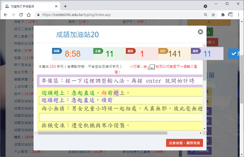首頁教育學習打字練習 「花蓮縣打字練習網」線上中、英文及注音符號打字練習 讓手指熟悉鍵盤每個英文字母、注音符號與相關符號的位置是中英文打字速度的關鍵,而這個關鍵必須要靠長時間的練習,如何才能事半功倍呢?透過打字練習軟體的訓練應該是個不錯的選擇,線上電腦中英文打字比賽雖然是為國小生而設計,但對中英文打字的初學者來說,反而是個入門的好幫手,該網站中英文練習題相當多,每次練習完也有成績比較(需先註冊),打字時,不要看著鍵盤打,熟能生巧,才能記住鍵盤符號位置,越練習成績就會越來越好。 如果你還需要尋找更適合自己的中英打練習軟體或線上工具,也可以看看本站介紹的其他 打字 工具。 🔔 不錯過任何精彩! 立即訂閱我們的 LINE 官方帳號 每次發佈新文章時,您將會第一時間收到本站文章連結通知,輕鬆掌握最新資訊! 使用 LINE 追蹤文章更新 §相關文章,還可以參閱:Live Typing Test:免費線上英文打字測試,提升速度與準確率typings:多語言線上免費打字練習工具,專為提升打字技能而設計Monkeytype 線上英打練習免費服務 快速提升打字速度與正確率TypingCat 提供英文打字課程、速度測試的免費網站TIPP10 免費且免安裝的英文打字練習軟體 如何使用「花蓮縣打字練習網」線上練習中、英文打字? 1.使用瀏覽器進入 「花蓮縣打字練習網」 網站,預設網頁就是中文打字的練習範本。。 2.網頁往下右側的功能選單可選擇其他打字練習範本,如果是初學者還可以看看手指在鍵盤上的正確擺法。 3.選擇題目後就會進入打字介面,請注意準備區所提示的事項,再按[ Enter ]就開始計時,邊打字就會邊統計。 4.注音符號打字練習,注意鍵盤輸入法是用英文輸入法來輸入 5.初學者如果要知道自己的實力,即便是在未登入的情況下,也可以看看別人的成績。 花蓮縣打字練習網網站網址:https://contest.hlc.edu.tw/typing/index.asp