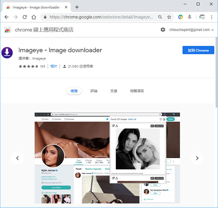 首頁瀏覽器擴充功能上傳下載 Imageye 下載網頁內的所有圖片 - Chrome 瀏覽器擴充功能 網頁內的圖片可以使用滑鼠右鍵點擊後,使用[ 另存圖片 ]來保存,如果有 10張圖片要下載,相同的動作就需要做 10次,不可謂不多,那麼該如何有效率的下載網頁內的圖片呢?Imageye 是個不錯的 Edge、Chrome 瀏覽器擴充功能,它可以一次將網頁內所有的圖片集合到自己的介面,並透過篩選器篩選自己所要的圖片來下載,可以在一般的網頁內使用,FaceBook 也可以,這樣來下載網頁內的圖片就方便多了。 🔔 不錯過任何精彩! 立即訂閱我們的 LINE 官方帳號 每次發佈新文章時,您將會第一時間收到本站文章連結通知,輕鬆掌握最新資訊! 使用 LINE 追蹤文章更新 §相關文章,還可以參閱:RedNote Video Downloader:小紅書影片下載器,免費瀏覽器擴充功能DownThemAll 讓你輕鬆下載網頁內所有檔案(瀏覽器擴充功能)「貓抓」可解析串流影片 m3u8 檔案並下載成 MP4 的瀏覽器擴充功能Apple Design Resources - Apple 官方提供的各種裝置外框、圖示、字體...等設計資源免費下載使用Mobile TikTok & Downloader 抖音影片下載瀏覽器擴充功能 如何安裝及使用 Imageye - Chrome 瀏覽器擴充功能? 1.使用 Chrome 瀏覽器到達 Imageye 安裝網址後,按[ 加到 Chrome ]便會開始引導用戶進行下載與安裝。 2.安裝完成後,瀏覽器的右上角會出現提示與擴充功能的圖示按鈕。 3.當在網頁內,點擊該按鈕後,便會開始掃描並列出該網頁內所有圖片。 4.每張圖片的左上角都可以單張下載,也提供篩選器篩選圖片大小來下載。 5.在 FaceBook 也是這樣操作。 6.也可以在 Google 圖片搜尋後,按上述方法下載。 Imageye網站網址:https://chrome.google.com/webstore/detail/imageye-image-downloader/agionbommeaifngbhincahgmoflcikhm?hl=en
