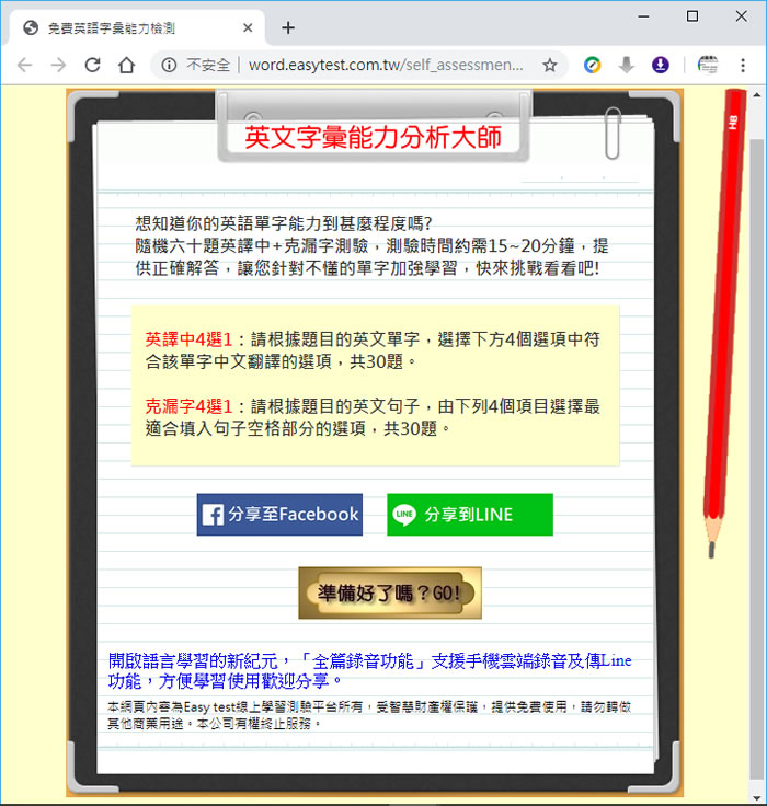 首頁教育學習學習資源 「英語字彙能力分析大師」線上就能免費英語字彙能力檢測 熟背與應用英文單字在學習英文的過程中佔有關鍵地位,但很多人背是背了,至於到考試的時候又能記得多少,又是一回事,現在「英語字彙能力分析大師」要來幫你解決這個難題,每次測驗會隨機出現 60題,30題的 4選 1英譯中,30題的 4選 1克漏字,測驗時間約 15到 20分鐘,並提供正確解答,讓你針對不熟悉的英文單字加強複習。 🔔 不錯過任何精彩! 立即訂閱我們的 LINE 官方帳號 每次發佈新文章時,您將會第一時間收到本站文章連結通知,輕鬆掌握最新資訊! 使用 LINE 追蹤文章更新 §相關文章,還可以參閱:研究生的福音來了!OpenAI Prism 自動幫你找文獻、排版、畫圖AI 運算的雙雄對決:解析 GPU 與 TPU 的差異與應用AI 心智圖備考術:用 Nano Banana Pro 拆解高普考範圍2026 QS 亞洲大學排名,亞洲前10排名、台灣57校上榜排名一次看免費版也能用 Google Gemini 引導式學習模式,讓 AI 家教帶你深度學習任何知識領域 如何使用「英語字彙能力分析大師」? 1.使用瀏覽器進入 「英語字彙能力分析大師」 網站,按[ 準備好了嗎?GO!]。 2.首先出現的題目是 30題的 4選 1英譯中。 3.接下來是 30題的 4選 1克漏字。 4.完成後,就會出現成績。