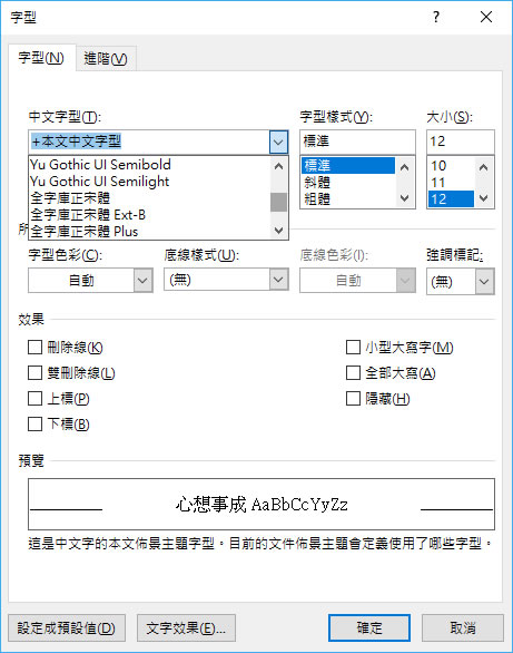 首頁操作技巧Word 如何更改 Word 預設字型? 常使用 Microsoft Office Word 編輯文件,應該會發現每當開啟一份新的編輯文件,其預設的字型就是「新細明體」,雖然編輯時要更改字型並不會太難,但也是需要操作,如果一開始就能按照自己安裝的字型當作預設的中文字型,這樣也不用每次開啟新的編輯文件,第一件事情就是要去更改預設的字型,讓編輯作業更為順暢 。 🔔 不錯過任何精彩! 立即訂閱我們的 LINE 官方帳號 每次發佈新文章時,您將會第一時間收到本站文章連結通知,輕鬆掌握最新資訊! 使用 LINE 追蹤文章更新 §相關文章,還可以參閱:「Word」如何讓「貼上」動作僅保留文字而不保留原有格式設定?如何直接開啟儲存在網路上的 Word、Excel 或 PDF 檔案?[ Word ]如何快速擷取螢幕畫面?[ Word ]如何使用 RAND 函數,快速產生隨機中、英文字盲文?[ Word ]如何製作具有開啟密碼保全的 PDF 檔案? 如何更改 Word 預設字型? 1.開啟一份新的編輯文件,可在功能表[ 常用 ]中,找到如下圖的圖示按鈕並點擊。 2.隨後會出現字型的設定視窗並在中文字型中選擇想要使用的字型,選擇好之後,按左下角的[ 設定成預設值 ]。 3.選擇[ 以 Normal.dotm 為範本的所有文件 ]後,按[ 確定 ]。 ※下次再開啟新的編輯文件,就會以新的預設中文字型來開始。
