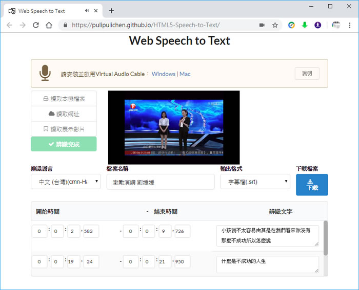 首頁線上工具翻譯辨識 Web Speech to Text 中、英語音轉文字,支援 MP3、MP4 檔案 要替影片加上字幕,或是將語音變成文字稿,如果真要純手工來製作,絕對不是件輕鬆的事情,這時候可以透過 Web Speech to Text 這個線上的語音轉文字免費服務來協助,可支援 WAV、OGG、MP3 聲音檔及 MP4 影片檔案,可以辨識中文(國語、普通話)及英語,文字輸出的格式可以是 .srt 字幕格式,也可以是 .ods 或 .txt 類型檔案,讓你方便後續的應用,該服務免註冊就可使用,且支援本機與線上檔案,像是 YouTube 影片,有需要製作影、音文字檔的需求,千萬別錯過。 🔔 不錯過任何精彩! 立即訂閱我們的 LINE 官方帳號 每次發佈新文章時,您將會第一時間收到本站文章連結通知,輕鬆掌握最新資訊! 使用 LINE 追蹤文章更新 §相關文章,還可以參閱:AI 翻譯新選擇:ChatGPT 翻譯功能全方位介紹與 Google 翻譯對比ScanQR 免費線上二維碼辨識工具,輕鬆解讀 QR Code 內容TTSMaker 線上文字轉語音免費工具,中文也沒問題Whisper JAX 免費語音轉文字工具,適用 Microphone、Audio File 及 YouTube 影片OLOCR 識別圖片或 PDF 內容文字,支援多國語言 如何使用 Web Speech to Text? 1.使用瀏覽器進入 Web Speech to Text 網站,會要求使用麥克風的權限,請按[ 允許 ]。 2.如過電腦沒有安裝過 Virtual Audio Cable 請按指示到相關網站下載並安裝,完成安裝,請執行該應用程式。 3.接下來選擇要轉文字的檔案,可以是本機電腦上的檔案,也可以是網址所連結的檔案。 4.選擇[ 辨識語言 ]、[ 輸出格式 ]後,按[ 開始辨識 ]。 5.以輸出字幕檔(.srt),辨識開始就會一一列出時間區段及文字,完成辨識後,也可以下載該 .srt 檔案。 Web Speech to Text網站網址:https://pulipulichen.github.io/HTML5-Speech-to-Text/