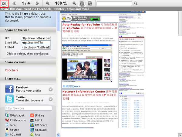 首頁線上工具網頁瀏覽 TxtBear 線上文件檔案分享及閱讀(PDF、HTML、DOC、XLS、PPT...) TxtBear 是一個免費提供文件檔案分享及可線上閱讀該分享文件的網站,支援的檔案格式有 PDF、HTML、ODT、DOCX、DOC、ODP、XLSX、XLS、ODS、TXT、RTF、PPTX 及 PPT 等文件檔案格式,使用的方式也很簡單,只要選擇檔案的分享權限並上傳即可,與其相類似的網站還有 iSendr 超方便的檔案分享服務!。 🔔 不錯過任何精彩! 立即訂閱我們的 LINE 官方帳號 每次發佈新文章時,您將會第一時間收到本站文章連結通知,輕鬆掌握最新資訊! 使用 LINE 追蹤文章更新 §相關文章,還可以參閱:Chrome 推出 Auto Browse:讓 AI 自動訂機票、找房子、填表單,還能即時改圖Google 搜尋『67』會發生什麼事?網友實測驚呼:螢幕活了!Google 2025 台灣年度搜尋榜:地震、普發現金、Gemini,我們都在找什麼?ChatGPT Atlas 瀏覽器問世:三大 AI 功能顛覆你的上網方式Microsoft Rewards 點數全自動狂賺法,一鍵設定、天天進帳! 如何使用 TxtBear? 1.進入 TxtBear 網站後,點選要分享的權限,並點擊[Browse...],選擇要上傳的文件檔案。 2.選擇完檔案後,便會開始上傳,上傳完成後,便會自動開啟該份文件,例如選擇[Public]並上傳一份PDF檔案,上傳時會顯示進度,完成後便直接開啟該份文件。 3.取得該份文件的分享網址或EMail給其他人,點擊右上角的[<]符號,便會展開分享方式及URL取得,若要嵌入自己的網頁,可將Embed處的HTML碼複製後貼到網頁上即可。 TxtBear網站網址:http://www.txtbear.com/
