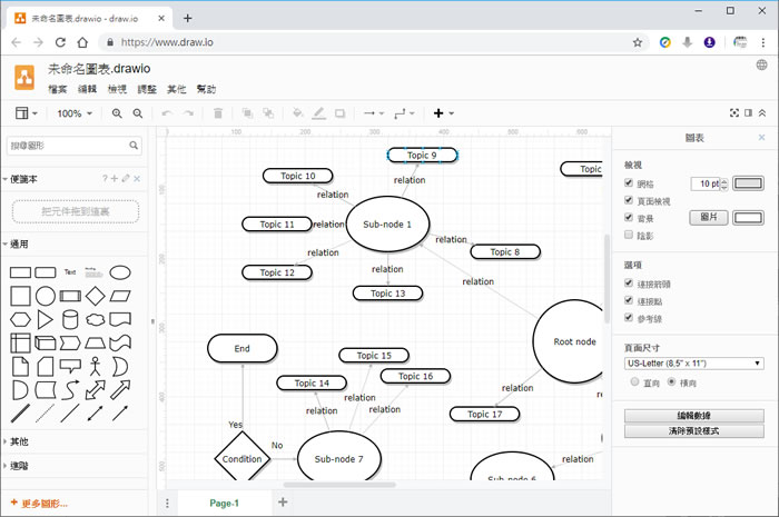 將作業內的工作項目以圖形的方式呈現,以軟體分析用的流程圖為例,再加入判斷後釐清工作的的先後次序,絕對會比用文字來描述來的清楚,而圖形有百百種,有些具有其專業性,有些則無,像是軟體分析用的流程圖四方形、長方形、菱形、箭頭...等不同的符號,各自被賦予不同的意涵,但若是要做沒有標準的圖形,例如網路示意圖,則就會在意使用的工具內是否提供足夠的相關圖形,可以利用,當然,繪製好的圖形,更要能提供匯出現行通用的檔案格式,才能方便流通。Draw.io 這個免費的 Web 應用程式,提供上述在內的多種符號圖形,像是通用型的基本符號、流程圖、UML、網路圖、辦公室、材料設計、工藝過程、模型、SiteMap......等所要用到的各式符號圖形,均有提供,也可以嵌入圖檔、Google 文件、iFrame...,當然,在你繪製完圖形後,所產生的檔案格式可以是 PNG、SVG、JPFEG 圖檔、PDF、HTML、URL...等,方便後續的分享與應用。