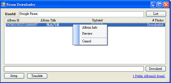 首頁電腦軟體上傳下載 Picasa Downloader Google Picasa 網路相簿下載工具(免安裝) Picasa Downloader 是一套 Google Picasa 網路相簿下載工具,Picasa Downloader 並無設計密碼輸入的功能,所以其主要的功能就是用來下載 Google Picasa 已公開的網路相簿,使用的方式非常簡單,只要輸入 Google Picasa 帳號便會列出該使用者已公開的網路相簿,便可以開始下載的程序。 🔔 不錯過任何精彩! 立即訂閱我們的 LINE 官方帳號 每次發佈新文章時,您將會第一時間收到本站文章連結通知,輕鬆掌握最新資訊! 使用 LINE 追蹤文章更新 §相關文章,還可以參閱:ArrowDL 全平台下載利器:輕鬆批量下載 YouTube、BT、FB與多站串流影片YouTubePlaylistDownloader 支援播放清單與頻道的 YouTube 影片下載工具,還能轉換格式Parabolic 讓 yt-dlp 更好用的免費影音下載工具,支援上千個網站的影音下載Hasleo Windows ISO Downloader 幫你從微軟網站下載原版 Windows ISO 檔XMusicDownloader 從音樂網站搜尋並下載歌曲的免費應用程式 如何使用Picasa Downloader? 1.下載免安裝版本後,滑鼠雙擊「PicasaDownloaderPortable.exe」便可直接開啟Picasa Downloader。 2.在UserId處輸入Google Picasa 帳號後,點擊[List]後,便會將該使用者已公開的相簿列出,選擇要下載的相簿,下載前若想先知道該項部的基本資訊及相簿內容,可使用滑鼠右鍵點擊,便會出現右鍵功能表。 3.若要開始下載,點擊[Download]便會開始下載,下載完成後,點擊[1 Album()s Fetched]便會開啟以下載的網路相簿。 Picasa Downloader版本:1.0.6.0語言:英文性質:免費適用:Windows官方網站:http://picasadownloader.codeplex.com/下載:安裝版按我下載 免安裝版按我下載