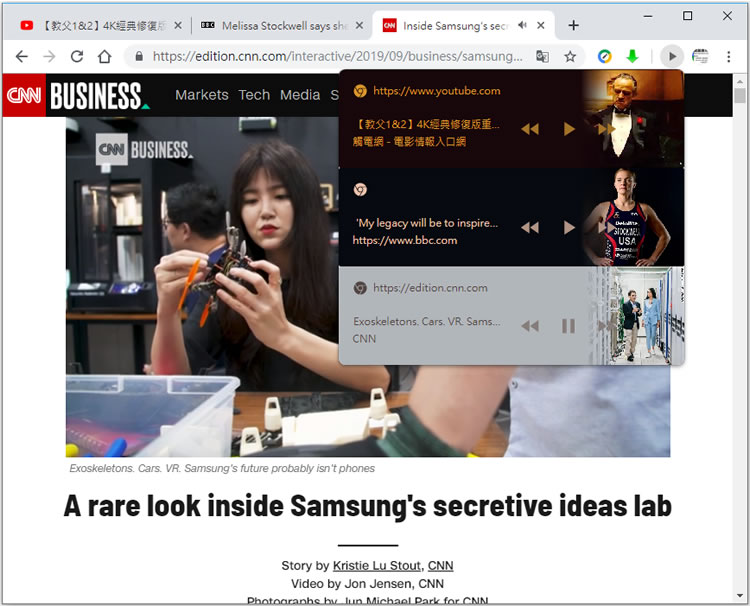 首頁操作技巧瀏覽器 如何在 Google Chrome 瀏覽器功能列上啟用影音播放/暫停按鈕? 瀏覽到帶有影片播放的網頁時,該影片的播放控制按鈕都是由該網頁的影片內建的,如果有多個分頁同時播放時,則需要分別去控制,相當麻煩,而在版本號為 77.0.3865.75 的 Google Chrome 瀏覽器,已經可以透過簡單的設定來開起功能列上的播放/暫停按鈕,如果有多個網頁同時播放影片,也可以在同一處進行控制,相當方便。 🔔 不錯過任何精彩! 立即訂閱我們的 LINE 官方帳號 每次發佈新文章時,您將會第一時間收到本站文章連結通知,輕鬆掌握最新資訊! 使用 LINE 追蹤文章更新 §相關文章,還可以參閱:Chrome 分割畫面免外掛!Google 官方教你一鍵並排雙視窗,工作效率大提升如何在 Chrome 中顯示 / 隱藏 AI 模式按鈕?flags 設定教學Google AI 模式正式支援繁體中文:一次搞懂功能、應用與影響Edge 不用開側邊欄!網址列直接輸入提示詞就能 AI 生圖與搜圖Edge、Chrome 瀏覽器複製已開分頁到新分頁,這招你一定要學起來 如何在 Google Chrome 瀏覽器功能列上啟用播放/暫停按鈕? 1.開啟 Chrome 瀏覽器,在其網址列上輸入 chrome://flags 後,按 Enter 鍵,便會看到如下頁面。 2.在 Search flags 處輸入 Global Media Controls,將預設的 Default 值,改成 Enabled 並按下[ Relaunch Now ]來重新啟用 Chrome。 3.重新啟用的 Chrome 瀏覽器,便可在其功能列上看到一個影片播放按鈕。 4.當有影片播放時,按下該按鈕,便可以直接控制該影片的播放。 5.多個頁面有影片播放時,也可以在同一處進行控制。
