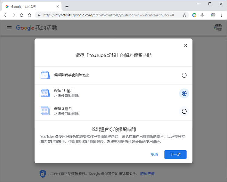 首頁操作技巧Google 如何自動刪除 YouTube 搜尋與觀看的歷史記錄? 在 YouTube 搜尋或觀看影片,都會有紀錄留下,這些紀錄保留多久呢?預設是「直到你手動刪除為止」,這些紀錄可以提供 YouTube 系統改善用戶的使用體驗,例如提醒用戶看過哪些影片、提供更合適的推薦內容,以及推薦可能會喜歡的創作者等。如果在觀看後不想保留,當然可以立刻手動刪除,如果只想保留一段時間就刪除的話,現行有提供 18個月及 3個月的選項供用戶自行選擇,更好的維護自己的觀看隱私。 🔔 不錯過任何精彩! 立即訂閱我們的 LINE 官方帳號 每次發佈新文章時,您將會第一時間收到本站文章連結通知,輕鬆掌握最新資訊! 使用 LINE 追蹤文章更新 §相關文章,還可以參閱:別再只會用兩指縮放 Google 地圖了!這些隱藏手勢讓你效率翻倍照著做就會!Google 官方釋出 NotebookLM 簡報製作的 8 種範例教學機車族專屬!Google Maps 推出 5 款超萌機車圖示 × 8 種顏色,設定步驟看這篇Google Skills:3000+ 門課程助你打造 AI 時代競爭力Google Vids 全解析:一文看懂功能、免費版限制及完整操作步驟 如何使用 Google 我的活動刪除 YouTube 影片搜尋與觀看紀錄? 1.使用瀏覽器進入 Google 我的活動 網站,便可看到相關說明。 2.按[ 選擇自動刪除 ],便可依需要按指示完成相關設定。