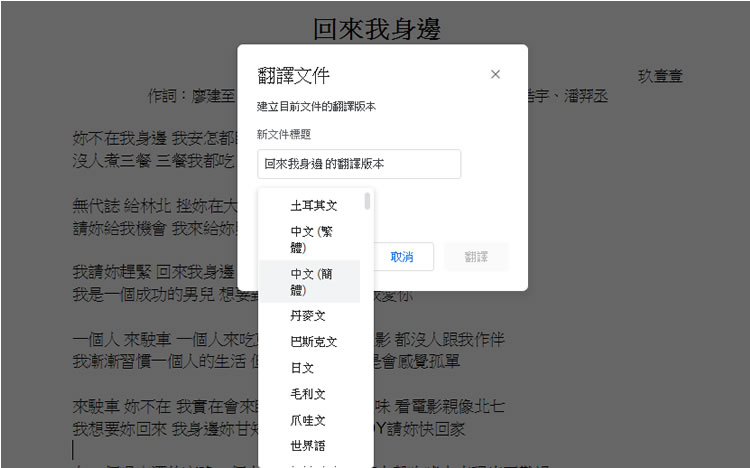 首頁操作技巧Google 文件 如何使用「Google 文件」快速讓繁體與簡體中文互相轉換? 雖說微軟的注音輸入法已經可以打出簡體中文字,但對取得的文件是簡體或繁體有轉換需求時,還是需要工具來輔助,最簡單的方法當然就是利用 Word 的內建功能,如果沒有 Office 也沒關係,也可以透過「Google 翻譯」功能來實現,如果是已經成形的 PDF 文件,除了透過「Google 文件」可以取出內文外,還可以直接編輯,當然,如果有簡、繁中文互相轉換的需求,在「Google 文件」也可以很輕易的辦到。 🔔 不錯過任何精彩! 立即訂閱我們的 LINE 官方帳號 每次發佈新文章時,您將會第一時間收到本站文章連結通知,輕鬆掌握最新資訊! 使用 LINE 追蹤文章更新 §相關文章,還可以參閱:「Google 文件」如何輸入分數?「Google 文件」共用文件如果有被編輯過或加入註解如何收到通知?「Google 文件」如何使用智慧型方塊插入 Google 地圖?「Google 文件」段落如何縮排?如何在「Google 文件」編輯電子郵件草稿後直接使用 GMail 預覽及發送? 如何使用「Google 文件」快速讓繁體與簡體中文互相轉換? 1.使用瀏覽器進入 「Google雲端硬碟」,開啟 Google 文件,便可以選擇[ 工具 ] > [ 翻譯文件 ]。 2.選擇要翻譯的語言。 3.翻譯的速度還是很有效率的。 4.也可以使用「Google 翻譯」功能來實現。 5.要翻譯整份文件也可以,但其中的圖片會消失。