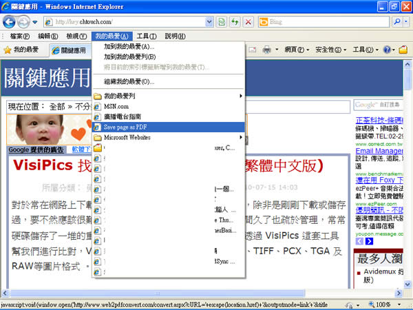 首頁線上工具檔案管理 Web2PDFConverter Tools 將網頁轉換成 PDF 格式 若要在瀏覽器上將所瀏覽的網頁轉換成 PDF 檔案格式,通常會加裝該瀏覽器適用的外掛元件或是由桌面軟體提供安裝在瀏覽器的元件,有些支援微軟的 Internet Explorer,而大部分的瀏覽器外掛程式則大都支援 Firefox 或 Google Chrome,不支援IE,操作起來很麻煩。由 Web2PDFConverter 該網站提供了另一個將網頁轉換成 PDF 格式的好方法,只要將 的按鈕加入[我的最愛]或[書籤],當碰到網頁要轉換時,只要從我的最愛或書籤列執行就可以了,對於轉出的 PDF 檔案對繁體中文的字體,支援的相當好。 🔔 不錯過任何精彩! 立即訂閱我們的 LINE 官方帳號 每次發佈新文章時,您將會第一時間收到本站文章連結通知,輕鬆掌握最新資訊! 使用 LINE 追蹤文章更新 §相關文章,還可以參閱:VERT:開源本地端檔案格式轉換器,隱私優先的免費瀏覽器轉檔工具PageSplitty 線上 PDF 分割轉 JPG、PNG、WebP 圖工具,支援 5GB 大小的大檔案PixDuplicate:免上傳快速找出並刪除重複照片的免費線上工具Adapter:全方位影片、音檔及圖片格式轉換免費軟體,支援影片轉音檔與圖片,音檔及圖片格式互轉TextCompare 線上比較 Excel、PDF 及圖片,快速找出檔案不同之處 如何將 Web2PDFConverter Tools 加入我的最愛? 1.進入上述網址後,找到有段[How to Add PDF Bookmarklet to Browser]其下便有詳細說明,以微軟的 Internet Explorer 為例,在 Internet Explorer 找到該[Save page as PDF]按鈕並點擊,將其加入[我的最愛]。 2.當看到要將其網頁轉成PDF檔案時,展開[我的最愛] > [Save page as PDF]。 3.點擊[Save page as PDF]後,會開啟另一個瀏覽器視窗,便會開始轉換程序。 4.轉換完成後,可下載該PDF檔或使用Google Docs直接線上觀看。 5.使用Google Docs直接線上閱讀。 Web2PDFConverter網站網址:http://www.web2pdfconvert.com/pdf-browser.aspx