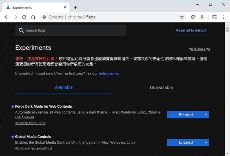 首頁操作技巧瀏覽器 如何在 Google Chrome 瀏覽器中強制所有網站都使用暗黑模式? 有用過 YouTube 的暗黑模式來觀看影片,大概都不會再改回去使用原來的使用模式,原因無他,因為原來的模式會比較刺眼,而針對不是 Google 的網站或服務,如果是使用 Google Chrome 瀏覽器來瀏覽,只要變更設定值,也可以將這些網站強制轉為暗黑模式,讓瀏覽網頁時,能取得對眼睛較為舒適的方式來瀏覽,如果真不習慣,還是可以改為原來的預設值。 🔔 不錯過任何精彩! 立即訂閱我們的 LINE 官方帳號 每次發佈新文章時,您將會第一時間收到本站文章連結通知,輕鬆掌握最新資訊! 使用 LINE 追蹤文章更新 §相關文章,還可以參閱:如何在 Chrome 中顯示 / 隱藏 AI 模式按鈕?flags 設定教學Google AI 模式正式支援繁體中文:一次搞懂功能、應用與影響Edge 不用開側邊欄!網址列直接輸入提示詞就能 AI 生圖與搜圖Edge、Chrome 瀏覽器複製已開分頁到新分頁,這招你一定要學起來Edge Android 版新增底部網址列功能,來看怎麼設定 如何在 Google Chrome 瀏覽器中強制所有網站都使用暗黑模式? 1.開啟 Google Chrome 瀏覽器後,在其網址列中輸入 chrome://flags/ 後,按[ Enter ]鍵。 2.在 Search flags 處,輸入 Force Dark Mode for Web Contents 並將該項的預設值,改為 Enabled 後,按[ Relaunch ]。 3.重新開啟 Chrome 瀏覽器後,就會發現訪問任何網站,都可以用暗黑模式來瀏覽。