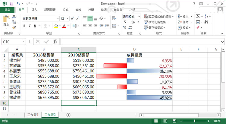 首頁操作技巧Excel [ Excel ] 如何計算兩個數字之間的差異百分比? 想要看出兩個數字間的百分比差異,Excel 是個相當好用的應用工具,例如要進行今年與去年銷售額的成長幅度,如果只是用兩個數字的相減,實在很難看出,但,如果以百分比來顯示時,就會讓人很有感覺,想要在 Excel 做出百分比差異,只要定義好公式,就能輕易做出,如果是負成長,還能用顏色特別標出,凸顯數據的價值。 🔔 不錯過任何精彩! 立即訂閱我們的 LINE 官方帳號 每次發佈新文章時,您將會第一時間收到本站文章連結通知,輕鬆掌握最新資訊! 使用 LINE 追蹤文章更新 §相關文章,還可以參閱:[ Excel、 Google 試算表 ] 如何找出最大值或最小值?[ Excel ]如何為「行」進行編號?[ Excel ]如何使用「交叉分析篩選器」快速篩選表格內的數據?[ Excel ]如何使用圖示集來凸顯儲存格內的值?[ Excel ]如何在圖表中以人形圖像呈現數據資料? Excel 如何計算兩個數字之間的百分比差異? 1.假設要比較兩個年度之間銷售額的增長幅度,有其以下數據。 2.替數字加上貨幣符號,可讓閱讀者更了解數據的意義。 3.計算兩數據之間的差異百分比,可在 D2 的位置,使用如左列的公式來計算 =(C2/B2)-1。 4.計算出的數據,可將其格式化成百分比。 5.格式化數據後,可利用醒目提示儲存格規則來凸顯數據的價值。 6.也可以加入資料橫條,讓數據更美觀直覺。 7.完成。