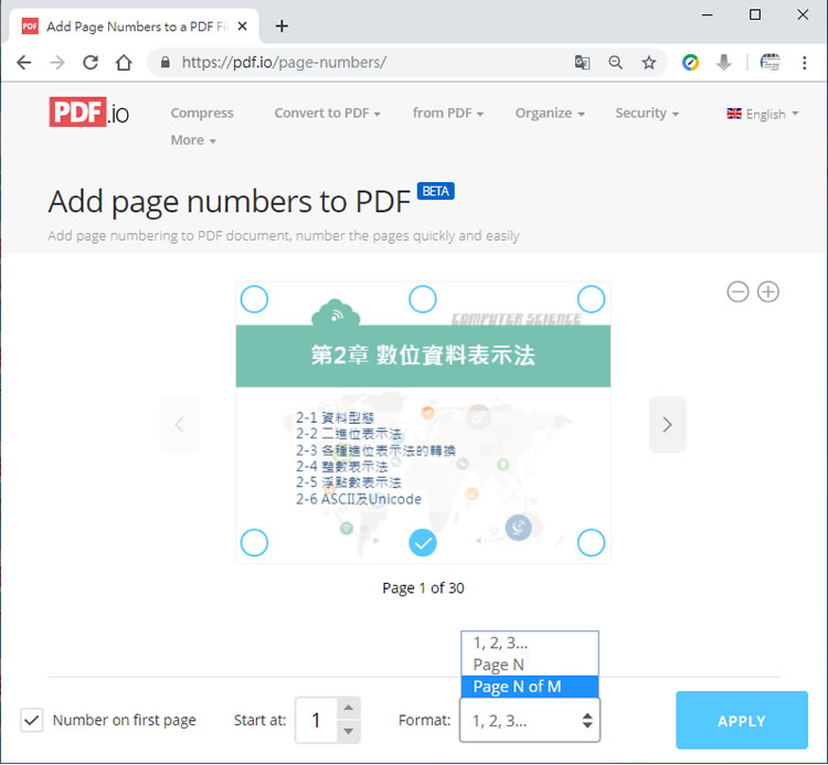 首頁線上工具文書編輯 如何替 PDF 文件加入頁碼? PDF 周邊的應用很多,像是壓縮、分割、合併、移除保全、圖檔轉 PDF 或是不同類型的文件轉 PDF 格式等,都有很多應用程式或網路服務可以免費使用,而 Add page numbers to PDF 這個免費的網路服務是 PDF.io 網站中眾多 PDF 應用中的其中一項,顧名思義就是幫 PDF 文件加入頁碼,只要將 PDF 上傳,並選好頁碼要出現的位置及頁碼樣式即可,相當簡單,該項服務不須註冊即可使用。 🔔 不錯過任何精彩! 立即訂閱我們的 LINE 官方帳號 每次發佈新文章時,您將會第一時間收到本站文章連結通知,輕鬆掌握最新資訊! 使用 LINE 追蹤文章更新 §相關文章,還可以參閱:DeckEdit:NotebookLM 簡報救星!PDF 轉 PPTX 零失真編輯章快圖:免費線上 PDF 騎縫章蓋章工具,安全快速OakPdf:模擬掃描器效果的 PDF 文件處理工具,輕鬆打造掃描質感線上文字內容差異比較工具:Little Differ 透過顏色標示快速找出不同之處免費 AI 句子產生器:AI Sentence Generator 讓 AI 根據指令以不同語氣創作或改寫句子,中文可 如何替 PDF 文件加入頁碼? 1.使用瀏覽器進入 PDF.io 網站,上傳文件來源可以是電腦內的 PDF 檔案,也可以是儲存在雲端硬碟內的 PDF 檔案或是檔案的 URL 位置。 2.完成 PDF 檔案上傳,就可以看到文件內容的上方及下方各有 3個圓圈圈,用戶可自行選擇頁碼要出現在頁面上的位置;若是首頁不要頁碼,可以將 Number on first page 取消勾選;Start at 可以選擇頁碼的起始編號;Format 則可以自行選擇頁碼樣式,完成後,可按[ APPLY ]。 3.點擊[ DOWNLOAD ]可下載檔案回自電腦,點擊 DOWNLOAD 旁的倒三角形圖示按鈕,可以選擇要儲存的運端硬碟服務。 4.已加入頁碼的 PDF 文件。 PDF.io網站網址:https://pdf.io/page-numbers/