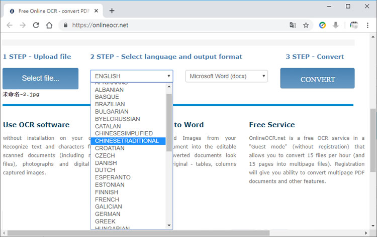 首頁線上工具翻譯辨識 Online OCR 圖片內文字辨識線上免費服務 面對有用的資訊,多數人的習慣就是拿出手機來拍照,以便於事後可以瀏覽吸收,但如果想要將圖片內容整理成電子檔,可以來試試 Online OCR 這個免費的網站服務,該服務可辨識 JPG、BMP、TIFF、GIF 圖檔格式,包含英文、中文、日語、法文、韓文....等在內的多國語言,並以 Word、Excel 或是文字檔來輸出,且免註冊,立即可用。 🔔 不錯過任何精彩! 立即訂閱我們的 LINE 官方帳號 每次發佈新文章時,您將會第一時間收到本站文章連結通知,輕鬆掌握最新資訊! 使用 LINE 追蹤文章更新 §相關文章,還可以參閱:AI 翻譯新選擇:ChatGPT 翻譯功能全方位介紹與 Google 翻譯對比ScanQR 免費線上二維碼辨識工具,輕鬆解讀 QR Code 內容TTSMaker 線上文字轉語音免費工具,中文也沒問題Whisper JAX 免費語音轉文字工具,適用 Microphone、Audio File 及 YouTube 影片OLOCR 識別圖片或 PDF 內容文字,支援多國語言 如何使用 Online OCR 辨識圖片內的文字? 1.使用瀏覽器進入 Online OCR 網站,按[ Select file...]來選取圖片。 2.選擇圖片內要辨識的語言。 3.選擇要輸出的文件格式,並按[ Convert ]來輸出,以下圖片,上為要辨識的圖片內容,下是已辨識出的文字。 Online OCR網站網址:https://www.onlineocr.net/