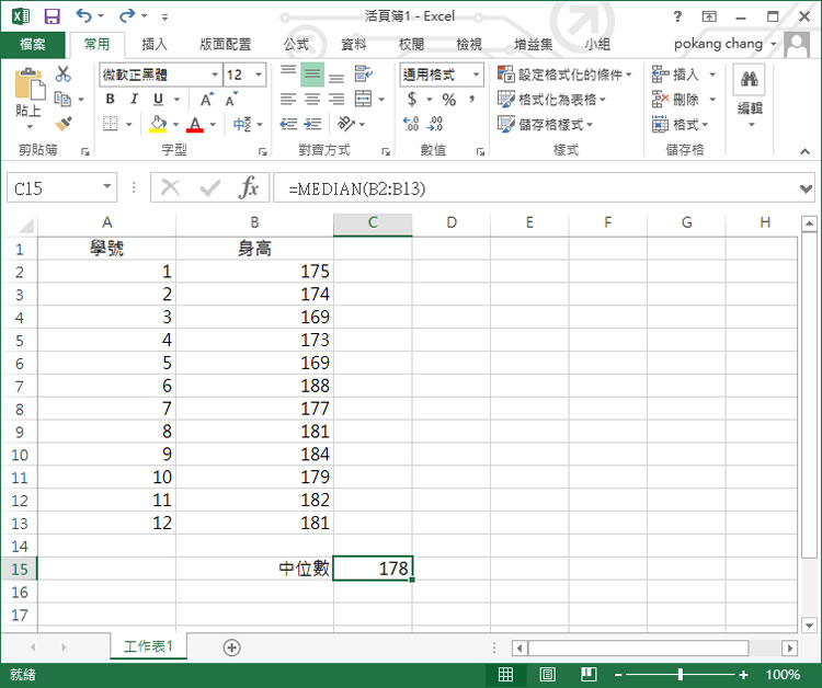 首頁操作技巧Excel 「Excel」如何計算中位數? 「中位數」是將一個數列集合在排序後劃分成兩個部分,找出正中間的一個作爲中位數,如果觀察值有偶數個,則中位數不唯一,通常是取最中間的兩個數值的平均數作爲中位數,其應用在樣本、種群或機率分布中的一個數值,Excel 提供 MEDIAN (number1, [number2], …) 函數,讓用戶輕鬆就可對數列進行中位數計算。 🔔 不錯過任何精彩! 立即訂閱我們的 LINE 官方帳號 每次發佈新文章時,您將會第一時間收到本站文章連結通知,輕鬆掌握最新資訊! 使用 LINE 追蹤文章更新 §相關文章,還可以參閱:[ Excel、 Google 試算表 ] 如何找出最大值或最小值?[ Excel ]如何為「行」進行編號?[ Excel ]如何使用「交叉分析篩選器」快速篩選表格內的數據?[ Excel ]如何使用圖示集來凸顯儲存格內的值?[ Excel ]如何在圖表中以人形圖像呈現數據資料? 如何計算中位數? 1.假設要計算班級中同學身高的中位數。 2.手動計算方式: 將數列由低至高先行排序 169,169,173,174,175,177,179,181,181,182,184,188 ( 12 + 1 ) / 2 = 6.5 169,169,173,174,175,177,179,181,181,182,184,188 因為是 6.5 所以取 6 及 7 的值來計算 中位數 = ( 177 + 179 ) / 2 =178 3.利用 excel 計算時,只需使用 MEDIAN (number1, [number2], …) 函數,便可輕鬆算出。