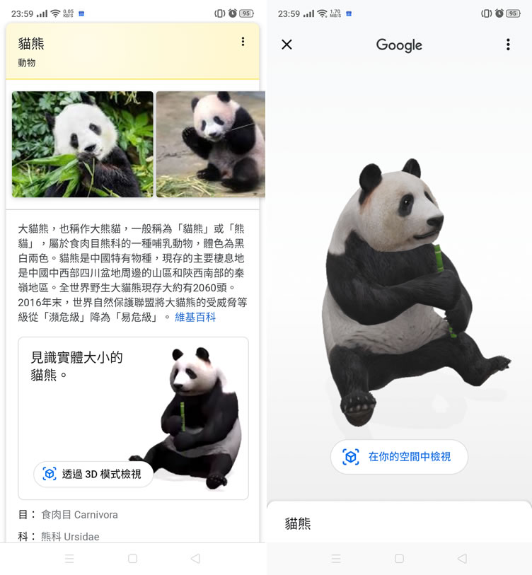 首頁移動設備生活資訊 手機開啟 Google 搜尋動物名稱,就可利用 AR 技術將其融入到現實環境中 擴增實境(Augmented Reality,簡稱AR)主要的功能就是可將虛擬的物件與現實環境做結合與互動,其應用相當廣泛,像是訓練駕駛員、醫生或是遊戲中都可以應用的到,最經典的遊戲就是寶可夢,如果沒接觸過 AR,現在也可以利用手機開啟「 Google 搜尋」搜尋動物名稱,像是狗、貓、熊貓、獅子、老虎...等,除了可以用 3D檢視該動物外,還可以將活生生的該動物,放到你現在所處的環境中,還能發出該動物特有的叫聲,相當逼真。 🔔 不錯過任何精彩! 立即訂閱我們的 LINE 官方帳號 每次發佈新文章時,您將會第一時間收到本站文章連結通知,輕鬆掌握最新資訊! 使用 LINE 追蹤文章更新 §相關文章,還可以參閱:停車不再靠運氣!用 LINE「雞來客棧_GLike」機器人 3秒快速找車位Google Play 公布 2023 年度最佳遊戲及應用程式榜單「中央氣象局E-地震測報」APP即時掌握地震動態手機開啟 Google 搜尋「Pac-Man」就讓 Hello Kitty、小精靈、布丁狗及動漫人物以 3D 出現在現實環境中Polnav mobile 手機離線導航免費軟體,不上網也能使用 如何使用 Google 搜尋動物名稱並開啟 AR? 1.手機開啟 Google Chrome 瀏覽器,並輸入動物名稱來搜尋,如果該動物有支援 AR,就可以看到搜尋結果中有透過 3D模式檢視,如果手機有安裝「Google Play 服務 - AR 適用」( Google Play 商店內有 ) 就可以使用 AR 檢視。 2.按[ 在你的空間中檢視 ],便會有說明與授權要求。 3.按照其指示將手機潮下找到地面,然後四處移動,隨後就可以看到該動物活生生的出現在該環境中。 ※不是搜尋所有的動物名稱都有 3D檢視與AR,可以試試狗、貓、熊貓、蛇、獅子、老虎、獵豹、企鵝、山羊...等
