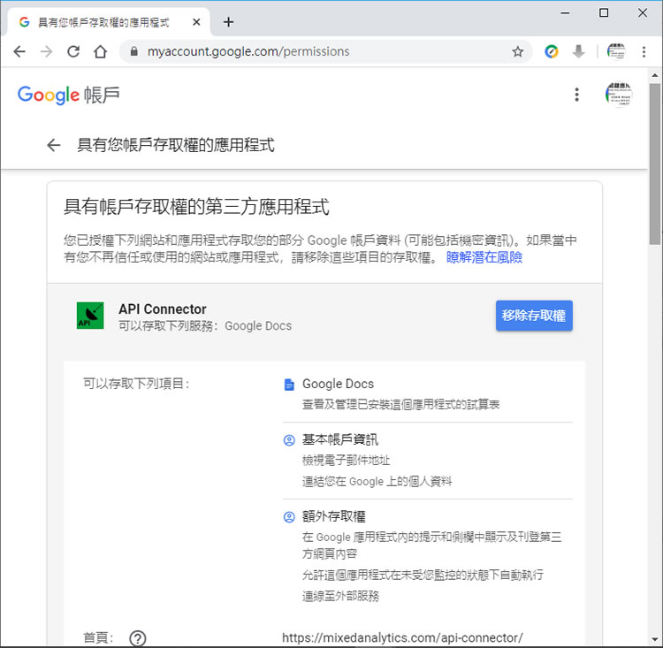 首頁操作技巧Google 如何移除具有 Google 帳戶存取權的第三方應用程式? 在使用某些網站服務或是應用程式時,如果需要註冊,通常會要求使用像是 Google、Microsoft、Facebook 等帳號進行註冊,這樣的作法對網站或應用程式的管理員來說除了方便管理,對用戶來說也簡單方便,不需要記住多組帳號密碼,但註冊容易,那要退出呢?或是時間久了,想要整理帳號所註冊過的網站服務或應用程式呢?如果是使用 Google 帳號,我們可以透過「Google 帳戶」這個 Google 服務來移除之前所註冊過有 Google 帳戶存取權的第三方應用程式,以保護帳號的安全。 🔔 不錯過任何精彩! 立即訂閱我們的 LINE 官方帳號 每次發佈新文章時,您將會第一時間收到本站文章連結通知,輕鬆掌握最新資訊! 使用 LINE 追蹤文章更新 §相關文章,還可以參閱:別再只會用兩指縮放 Google 地圖了!這些隱藏手勢讓你效率翻倍照著做就會!Google 官方釋出 NotebookLM 簡報製作的 8 種範例教學機車族專屬!Google Maps 推出 5 款超萌機車圖示 × 8 種顏色,設定步驟看這篇Google Skills:3000+ 門課程助你打造 AI 時代競爭力Google Vids 全解析:一文看懂功能、免費版限制及完整操作步驟 如何移除具有 Google 帳戶存取權的第三方應用程式? 1.使用瀏覽器進入 「Google 帳戶」 網站,登入後,便可在左側方的功能表,點擊[ 安全性 ]。 2.在具有帳戶存取權的第三方應用程式處,點擊[ 管理第三方存取權 ],進入後,可以找出具有帳戶存取權的第三方應用程式及可透過 Google 帳戶登入網路服務。 3.點擊展開已授權項,除目可檢視詳細資訊外,也可以[ 移除存取權 ]。