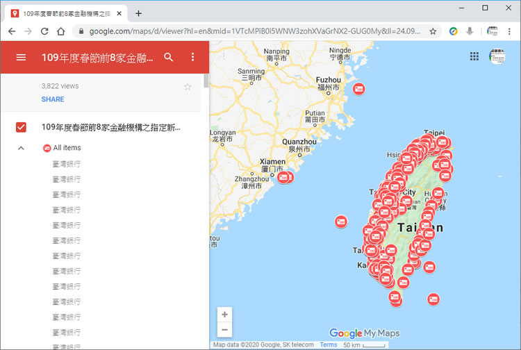 首頁線上工具生活資訊 中央銀行公布 109年農曆春節前兌換新鈔各銀行與郵局一覽表 春節快到了,除了大掃除外,新鈔票也得準備,不論是給長輩、小孩,在傳統的除舊佈新的觀念下,既然要包紅包,那就費點心思,給新鈔,尤其是紅色的 100元有誠意又討喜,中央銀行已選定臺灣銀行、臺灣土地銀行、合作金庫商業銀行、第一商業銀行、華南商業銀行、彰化商業銀行、臺灣中小企業銀行及中華郵政公司等 8家金融機構,選定 454家分行(郵局)為本(109)年指定兌鈔據點,新鈔兌換日程訂於本年 1月 16日(週四)至 1月 22日(週三),計連續5個營業日。上述期間,7家銀行之 371家指定兌鈔分行,以及中華郵政公司位於都會區之 25家指定兌鈔郵局,均將開設「新鈔兌換專櫃」,以加強服務民眾;另58家偏遠地區郵局,則於一般營業櫃檯辦理兌換新鈔,且為加強服務民眾,中央銀行特於「新鈔兌換地點一覽表」中建立地圖連結,民眾於可於中央銀行官網、臉書及行動 APP上可輕鬆查詢到指定兌鈔地點位置,另也結合Google地圖 ( https://bit.ly/33huIcL )及 QR Code,方便民眾使用手機查找,要兌換新鈔,趕快來看看住家附近有沒有換新鈔的銀行或郵局地點吧。 🔔 不錯過任何精彩! 立即訂閱我們的 LINE 官方帳號 每次發佈新文章時,您將會第一時間收到本站文章連結通知,輕鬆掌握最新資訊! 使用 LINE 追蹤文章更新 §相關文章,還可以參閱:Apple Music 台灣新用戶優惠:6個月免費暢聽,領取方式與限制一次看!2026春節追劇清單!Netflix 2月必看攻略:燒腦推理、火爆動作片,陪你從初一爽追到開工!459 萬人搶 60 萬份!運動幣中獎號碼公布,快查你的身分證尾數都馬一起GO!LINE GO新年優惠最高拿$800優惠券,還有一個月乘車金等你抽過年搭高鐵自由座要排多久?看LINE就知道 台灣高鐵×LINE TODAY推出春節限定燈號預估服務 109年度春節前 8家金融機構及 454家分行(郵局)之指定新鈔兌換分行一覽表 1.使用 Edge 或 Chrome 瀏覽器,點擊 新鈔兌換據點一覽表 ,便可開啟。 2.需要銀行或郵局詳細位置圖,可以點擊一覽表內的地名來開啟 Google 地圖。