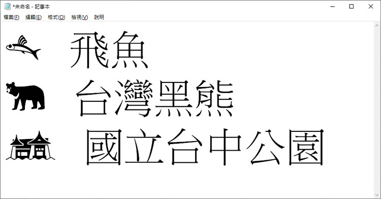 5.開啟文書編輯軟體,本例使用記事本,將字型選擇城剛剛所安裝的 Taiwan icon 20。