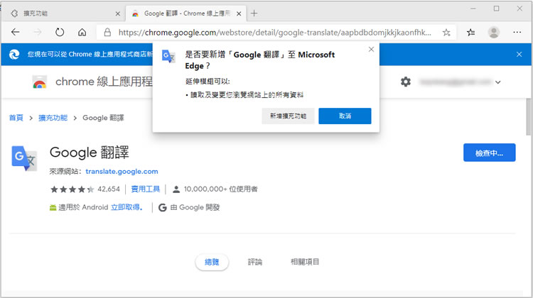 首頁操作技巧瀏覽器 微軟 Edge 瀏覽器如何安裝 Chrome 擴充功能? 微軟以 Chromium 為核心的新版 Edge 瀏覽器已正式推出,那麼它可以安裝 Chrome 瀏覽器的擴充功能嗎?答案是可以的,但 Edge 瀏覽器預設是只能到 Microsoft Store 安裝自家的擴充功能,但,畢竟 Chrome 的擴充功能發展已久,有相當多的實用性的功能可以用,那麼要如何更改設定,讓 Edge 也可以去安裝 Chrome 的擴充功能呢?微軟還是很不錯的,只需要開啟[ 允許來自其他存放區的擴充功能 ]就可以讓用戶自行選擇要安裝 Microsoft Store 或是 Chrome 線上應用程式商店的擴充功能。 🔔 不錯過任何精彩! 立即訂閱我們的 LINE 官方帳號 每次發佈新文章時,您將會第一時間收到本站文章連結通知,輕鬆掌握最新資訊! 使用 LINE 追蹤文章更新 §相關文章,還可以參閱:如何在 Chrome 中顯示 / 隱藏 AI 模式按鈕?flags 設定教學Google AI 模式正式支援繁體中文:一次搞懂功能、應用與影響Edge 不用開側邊欄!網址列直接輸入提示詞就能 AI 生圖與搜圖Edge、Chrome 瀏覽器複製已開分頁到新分頁,這招你一定要學起來Edge Android 版新增底部網址列功能,來看怎麼設定 微軟 Edge 瀏覽器如何安裝 Chrome 擴充功能? 1.開啟 Edge 瀏覽器,在網址列輸入 edge://extensions/ 後,按鍵盤的 Enter 鍵。 2.在開啟的頁面中,將左下角的[ 允許來自其他存放區的擴充功能 ]開啟即可。 3.試著安裝 Chrome 線上應用程式商店 內的 Chrome 擴充功能,以安裝 Google Translate 為例。 4.按[ 加到 Chrome ],便會展開一連串的安裝過程。 5.安裝的擴充功能都可以在 edge://extensions/ 頁面中進行管理。