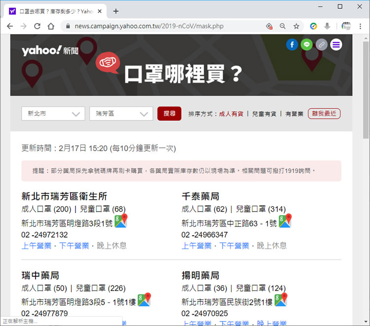 首頁線上工具生活資訊 口罩去哪買?庫存剩多少?Yahoo即時報你知 新型冠狀病毒疾病「COVID-19」的疫情在台灣已有 20例確診,對一般民眾來說,配合衛生福利部所宣導的防疫步驟在必要的場合戴口罩,落實肥皂勤洗手、避免觸摸眼鼻口及做好咳嗽禮節,似乎也不必太過恐慌,上述兩物資,肥皂及口罩,肥皂應該不是問題,口罩卻有一罩難求的現象,尤其是下周一學校高、國中小會陸續開學,口罩需求量勢必將大增,在有口罩購買規則的前提下(口罩販售實名制2月6日上路,民眾可持健保卡購買 - 衛生福利部疾病管制署),且每家健保藥局的口罩販售時間、規則都不一樣時,該如何能夠買的到,就成為民眾的一個難題,Yahoo 在其新冠肺炎專區下,也提供「口罩去哪買?」的查詢專頁,資訊是按口罩餘量進行排序,庫存量越高排名越前面,且每 10分鐘更新一次,有需要的用戶或許可以參考看看。 🔔 不錯過任何精彩! 立即訂閱我們的 LINE 官方帳號 每次發佈新文章時,您將會第一時間收到本站文章連結通知,輕鬆掌握最新資訊! 使用 LINE 追蹤文章更新 §相關文章,還可以參閱:Apple Music 台灣新用戶優惠:6個月免費暢聽,領取方式與限制一次看!2026春節追劇清單!Netflix 2月必看攻略:燒腦推理、火爆動作片,陪你從初一爽追到開工!459 萬人搶 60 萬份!運動幣中獎號碼公布,快查你的身分證尾數都馬一起GO!LINE GO新年優惠最高拿$800優惠券,還有一個月乘車金等你抽過年搭高鐵自由座要排多久?看LINE就知道 台灣高鐵×LINE TODAY推出春節限定燈號預估服務 如何使用 Yahoo!口罩哪裡買?查詢附近健保藥局的口罩庫存量? 1.使用瀏覽器進入 Yahoo!口罩哪裡買? 網頁,就可以輸入查詢縣市、地區後按[ 搜詢 ]。 2.預設是以成人有貨的方式進行排序,庫存越高排越前面,用戶可在排須方式自選變更其他排序方式。 3.顯示的資訊除了地址、電話及營業時間外,如果確定該健保藥局具體位址,也可以按地址後面的 Google 地圖圖示,用地圖來顯示。 Yahoo!網站網址:https://news.campaign.yahoo.com.tw/2019-nCoV/mask.php