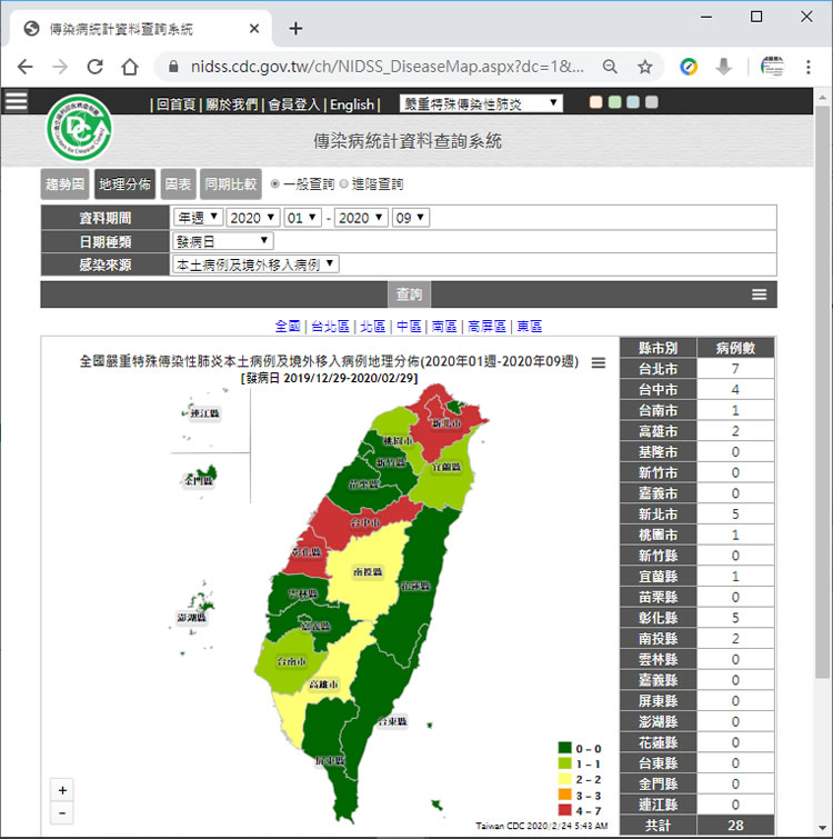 首頁線上工具生活資訊 衛生福利部疾病管制署公布新冠肺炎病例地理分布圖 該不該公布新冠狀病毒各縣市的感染病例數及包機返台後的隔離點,一直都有正、反面的說法,而如今在「衛生福利部疾病管制署-傳染病統計資料查詢系統」的網站就可以查詢各縣市感染新冠狀病毒病例數並以台灣地圖來呈現,其實,該網站不僅僅是以新冠肺炎為主,舉凡各類法定傳染病像是流感、登革熱、腦炎...等等,均可在該網站取得最正確的資訊。 🔔 不錯過任何精彩! 立即訂閱我們的 LINE 官方帳號 每次發佈新文章時,您將會第一時間收到本站文章連結通知,輕鬆掌握最新資訊! 使用 LINE 追蹤文章更新 §相關文章,還可以參閱:【2026行事曆】115年春節放9天史上最長!9大連假、寒暑假時間一次看臺北捷運QR乘車碼上路!支付業者、信用卡感應、轉乘優惠完整攻略Disney+ 跨年追劇清單!2025年末7部台韓美陸劇+1部必看演唱會電影2026台北跨年全攻略:演唱會時間地點、完整卡司名單、101煙火轉播懶人包Gemini 新年賀卡來了!日本郵便推出『#Gemini で年賀状』服務,9種模板3種尺寸任選 如何使用「衛生福利部疾病管制署-傳染病統計資料查詢系統」? 1.使用瀏覽器進入 「衛生福利部疾病管制署-傳染病統計資料查詢系統」 網站,可以選擇要查詢的法定傳染病種類。 2.提供各式條件進行篩選,並以趨勢圖、地理分布、圖表、同期比較等圖形呈現。 衛生福利部疾病管制署-傳染病統計資料查詢系統網站網址:https://nidss.cdc.gov.tw/ch/NIDSS_DiseaseMap.aspx?dc=1&dt=5&disease=19CoV