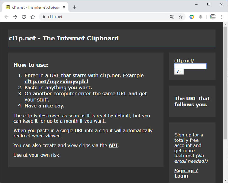 首頁線上工具生產力工具 cl1p.net 網路剪貼簿,快速分享文字資料 Google Chrome 瀏覽器可以在不同裝置間傳送網頁文字,但前提是裝置必須使用相同的 Google 帳號並開啟同步處理功能,但如果要與他人共享某段文字資料呢?很多人大概會想到將它儲存成檔案,然後傳過去,這樣的操作步驟有點多了,cl1p.net 這個免費的網站服務,可以讓用戶自訂一個 cl1p.net 的後綴網址,貼上要共享的文字資料,接下來,對方僅需要使用手機掃描該 QRCode ,開啟瀏覽器瀏覽相同的網址,便可以取得該文字資料。 🔔 不錯過任何精彩! 立即訂閱我們的 LINE 官方帳號 每次發佈新文章時,您將會第一時間收到本站文章連結通知,輕鬆掌握最新資訊! 使用 LINE 追蹤文章更新 §相關文章,還可以參閱:Google AI Plus 降到 260 元對決 ChatGPT Go!誰的功能更值得訂閱?ChatGPT Go 月付 290 元值得嗎?免費版、Plus 完整比較用 AI 做出的電影,YouTube 就看得到!一起來欣賞這部贏得百萬美元的突尼西亞短片《Lily》Apple Creator Studio 來了:Final Cut Pro、Logic Pro 等九款 App 月付 390 元,學生優惠僅 90 元ChatGPT 智慧購物功能登台!台灣用戶也能用 AI 做商品研究與比價 如何使用 cl1p.net 共享文字資料? 1.使用瀏覽器進入 cl1p.net 網站,可以在右上角(下圖紅色框)處輸入自訂的後綴網址後,按[ Go ]。 2.接下來在編輯框內貼上要共享的文字資料,並選擇該網址要存活的時間,預設是讀過就會刪除該網址,用戶可自行選擇,最後,按[ Paste and Create ]。 3.將網址或是 QRCode 傳送給接收方。 4.接收方可用裝置內的瀏覽器瀏覽該網址,就可取得該文字資料。 (以上文字取自 早安健康) cl1p.net網站網址:https://cl1p.net/