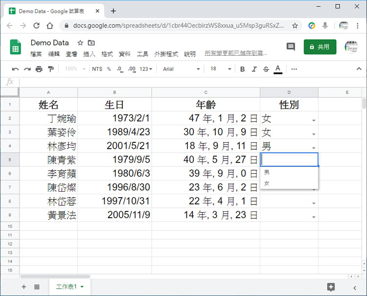 首頁操作技巧Google 試算表 [ Google 試算表 ]如何建立下拉式清單? 在「Google 試算表」內建立下拉式清單,讓用戶在輸入時,可以進行選擇,這不僅僅是為了方便,更有助於資料的一致性,例如人員的基本資料可能包含性別,有人會輸入男或男性、女或女性,而部門名稱如果沒有統一,財務部也可能能被輸入成財務會計部,資料的不一致,對日後的篩選、統計都會出現問題,因此,規範資料的輸入,使其具有一致性是絕對有其必要性,那麼,在「Google 試算表」內如何建立下拉式清單呢? 🔔 不錯過任何精彩! 立即訂閱我們的 LINE 官方帳號 每次發佈新文章時,您將會第一時間收到本站文章連結通知,輕鬆掌握最新資訊! 使用 LINE 追蹤文章更新 §相關文章,還可以參閱:「Google 試算表」如何讓儲存格的寬度、高度大小都相同?「Google 試算表」如何使用 SEQUENCE 函數傳回有序數字陣列?「Google 試算表」如何計算兩個數字之間的差異百分比?「Google 試算表」如何計算儲存格中不重複值個數?「Google 試算表」如何免計算就可得知所圈選儲存格內的加總、平均值、最大及最小值? 「Google 試算表」如何建立下拉式清單? 1.以下圖的資料為例,要建立性別欄的下拉式清單,可以將該欄位選取後,按上方功能表[ 資料 ] > [ 資料驗證 ]。 2.在條件處,選擇項目清單,並在其後輸入清單值,例如 男,女,項目與項目之間是用 , 逗號分開,完成輸入後,按[ 儲存 ]。 3.回到原介面,就可以看到該欄位的右邊出現向下的箭頭符號,點擊後,便可出現剛剛輸入的下拉式清單值。