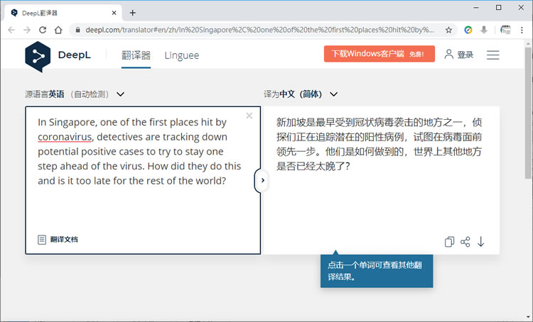 首頁線上工具翻譯辨識 DeepL 比機器翻譯更貼近用人工翻譯的線上翻譯器 Google 與 Microsoft 都有線上翻譯的應用,以翻譯成中文來說其語句讀起來通常都有英文文法,不過對很多人說,至少大致上的意思不會錯即可,DeepL 是個德國網站,使用過的人大都表示讀起來比較通順,像是個人而非機器去翻譯出來的,而現在 DeepL 也開始支援中文(簡體),翻譯的結果,用戶可以用同一段原文來個三方比較,就可以知道誰的翻譯結果更為通順。 🔔 不錯過任何精彩! 立即訂閱我們的 LINE 官方帳號 每次發佈新文章時,您將會第一時間收到本站文章連結通知,輕鬆掌握最新資訊! 使用 LINE 追蹤文章更新 §相關文章,還可以參閱:AI 翻譯新選擇:ChatGPT 翻譯功能全方位介紹與 Google 翻譯對比ScanQR 免費線上二維碼辨識工具,輕鬆解讀 QR Code 內容TTSMaker 線上文字轉語音免費工具,中文也沒問題Whisper JAX 免費語音轉文字工具,適用 Microphone、Audio File 及 YouTube 影片OLOCR 識別圖片或 PDF 內容文字,支援多國語言 如何使用 DeepL 進行翻譯? 1.使用瀏覽器進入 DeepL 網站,選擇要翻譯的語言。 2.在左側貼上原文,右側就會出現譯文。 3.下圖是微軟與 Google 對同一段原文所翻譯出來的結果,相信結果很明顯。 DeepL網站網址:https://www.deepl.com/translator