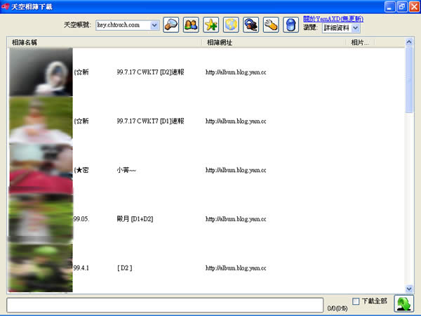 首頁電腦軟體上傳下載 YamAXD 天空(YAM)網路相簿及影音下載器(免安裝) YamAXD - Yam Album Xpress Download 是一套 天空(YAM)網路相簿及影音下載工具。 🔔 不錯過任何精彩! 立即訂閱我們的 LINE 官方帳號 每次發佈新文章時,您將會第一時間收到本站文章連結通知,輕鬆掌握最新資訊! 使用 LINE 追蹤文章更新 §相關文章,還可以參閱:ArrowDL 全平台下載利器:輕鬆批量下載 YouTube、BT、FB與多站串流影片YouTubePlaylistDownloader 支援播放清單與頻道的 YouTube 影片下載工具,還能轉換格式Parabolic 讓 yt-dlp 更好用的免費影音下載工具,支援上千個網站的影音下載Hasleo Windows ISO Downloader 幫你從微軟網站下載原版 Windows ISO 檔XMusicDownloader 從音樂網站搜尋並下載歌曲的免費應用程式 YamAXD主要特色及功能如下: 可以同時開啟多個視窗 可一次下載多本相簿 多種瀏覽方式 半自訂下載格式 同一個帳號瀏覽速度加快 記憶帳號跟設定檔合併 記憶好友帳號 直接前往相簿網頁 清除快取 影音檔案下載(F9)-http://mymedia.yam.com/ 支援大量影音網址下載(F11) 影音支援帳號搜尋檔案 加速影音資料擷取速度-新增單筆資料重新擷取(右鍵內) 輸出影音資料(右鍵內)-新增自定輸出 支援密碼相簿下載(支援多組預設密碼) 如何使用 YamAXD ? 1.下載解壓縮後,滑鼠雙擊「YamAXD.exe」便可直接開啟 YamAXD,開啟後,在天空帳號處輸入Yam 帳號後,點擊旁邊的放大鏡按鈕後,便會將該使用者已公開的相簿列出。 2.選擇要下載的相簿(可多選),選擇好之後,點擊右下角開始下載,若要下載全部的相簿,可勾選右下角的[下載全部]。 3.若是需要密碼的相簿才能下載,在下載的時候便會要求輸入密碼。 4.若要調整下載的相片長寬或相片存放路徑,可點擊[設定],並在後續的設定視窗中進行設定。 5.若要下載YAM影音,可點擊[影音下載],點擊後便會出現下載視窗。 6.在所出現的視窗中,若要單個加入,在影音網址處輸入後,點擊[加入],若有大量要下載的網址,可以點擊[大量增加]來加入。 7.點擊右下角[開始下載],便會開始下載的程序。 YamAXD版本:1.0.2.6語言:繁體中文性質:免費適用:Windows官方網站:http://hex1943.pixnet.net/blog下載:按我下載