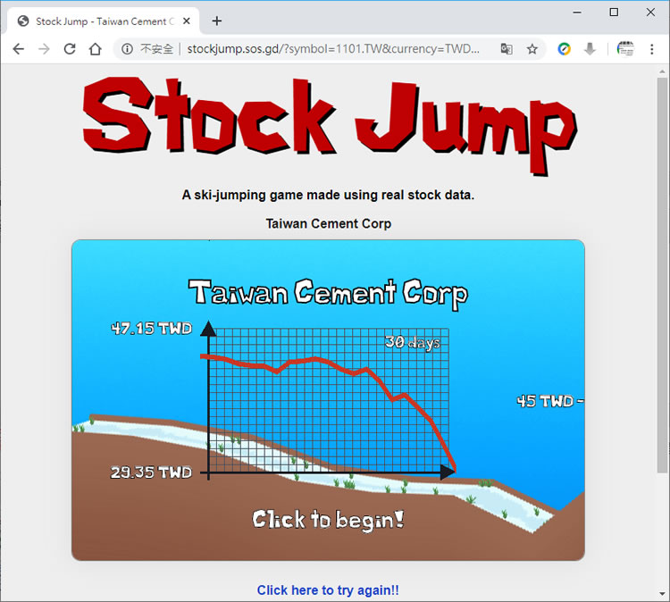 首頁線上工具益智遊戲 Stock Jump 用股票走勢圖做出的滑雪跳遠遊戲 將某支股票的 30天走勢圖當作滑雪賽道,然後讓玩家比賽誰跳得遠,其實滿慘忍的,近期,因新冠肺炎造成各國股市大起大落,Stock Jump 這個線上遊戲就出現了,他將股票走勢圖變成滑雪賽道,既然是滑雪跳遠比賽,那賽道應該在最後會有斷崖式下降,這也意味著這隻個股最近狀態不好,算是苦中作樂吧,有買股票嗎?看看你買的股票可以跳出幾公尺遠,別懷疑,世界各國主要股市含台灣的個股都有。 🔔 不錯過任何精彩! 立即訂閱我們的 LINE 官方帳號 每次發佈新文章時,您將會第一時間收到本站文章連結通知,輕鬆掌握最新資訊! 使用 LINE 追蹤文章更新 §相關文章,還可以參閱:Google Doodle 萬聖節遊戲登場!小精靈 45 週年特別版完整介紹毫秒級反應力大挑戰!用 Reaxon 訓練大腦、眼睛與手的協調反應2048 Cupcakes 經典單人 2048 滑塊線上遊戲,AI 輔助輕鬆挑戰高分免費線上拼圖遊戲平台:iLoveJigsaw 可自行上傳圖片製作拼圖Songlio:線上聽音樂猜歌曲名稱遊戲,可自訂歌曲題庫並與多人一起挑戰 如何玩 Stock Jump 滑雪跳遠比賽? 1.使用瀏覽器進入 Stock Jump 網站,挑選要玩的國別。 2.以台灣台灣水泥( 1101 )為例。 3.點擊[ Click to begin ]會先出現個股 30天走勢圖,再點擊一次就可開始。 5.只要使用滑鼠左鍵就可以玩。 Stock Jump網站網址:http://stockjump.sos.gd/