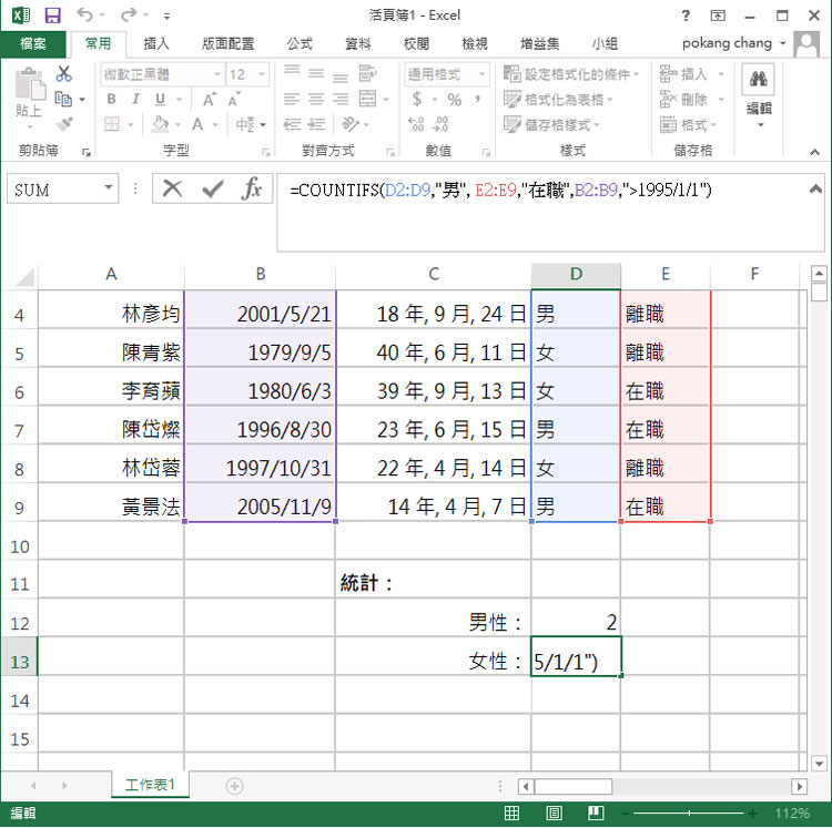 首頁操作技巧Excel [ Excel ]如何使用 COUNTIF 與 COUNTIFS 在多條件判斷下來計算數量? 利用 Excel 做好的表格,如果需要統計總數量可以使用 SUM 這個系列函數,如果需要根據某個條件計算個數,則可以使用 COUNTIF 函數,例如員工要根據性別分開計算,但如果還要加入更多的判斷,例如人數除了根據性別統計外,還需要剃除已離職的員工,這時候,我們就可以使用 COUNTIFS 這個函數,使其可以加入更多的判斷條件,以符合我們的計算要求。 🔔 不錯過任何精彩! 立即訂閱我們的 LINE 官方帳號 每次發佈新文章時,您將會第一時間收到本站文章連結通知,輕鬆掌握最新資訊! 使用 LINE 追蹤文章更新 §相關文章,還可以參閱:[ Excel、 Google 試算表 ] 如何找出最大值或最小值?[ Excel ]如何為「行」進行編號?[ Excel ]如何使用「交叉分析篩選器」快速篩選表格內的數據?[ Excel ]如何使用圖示集來凸顯儲存格內的值?[ Excel ]如何在圖表中以人形圖像呈現數據資料? 如何使用 COUNTIF 與 COUNTIFS 在多條件判斷下來計算數量? 1.我們用以下的表格資料來說明。 2.利用 COUNTIF 函數,根據性別或出生年月日計算人數,範例如下: =COUNTIF(D2:D9,"男") =COUNTIF(B2:B9,">1995/1/1") 可以用 >(大於)、<(小於)、<>(不等於)、>=(大於等於) 或 <=(小於等於) 3.利用 COUNTIFS 函數,根據性別及狀態或紹數 2條件再加入出生年月日計算人數,範例如下: =COUNTIFS(D2:D9,"男", E2:E9,"在職") =COUNTIFS(D2:D9,"男", E2:E9,"在職",B2:B9,">1995/1/1")
