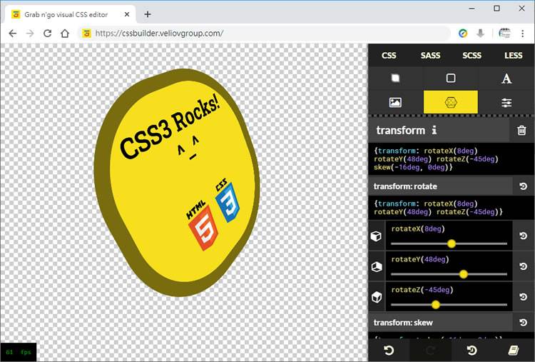首頁線上工具開發工具 CSS Grab n' Go Editor 可視化 CSS 語法產生器 階層樣式表 (Cascading Stylesheets,CSS) ,最主要的功能就是讓 HTML 網頁上的元素套用不同的樣式,讓同一個元素可以有不同的樣貌呈現,不過對於初學者而言,要了解整個 CSS 語法規則並不容易,除了時間之外,如果有輔助的工具可以協助,相信可以更快的跨過門檻,CSS Grab n' Go Editor 是個可視化的 CSS 語法編輯器,其主要鎖定 border、box-shadow、text、filter、transform 常用屬性進行變化,用戶可以透過可操作的面板進行屬性值變更,且立刻可看到所產生的變化,完成整個調整,還可以快速產生 CSS、SASS、SCSS 及 LESS 相關語法,快速套用到元素上。 🔔 不錯過任何精彩! 立即訂閱我們的 LINE 官方帳號 每次發佈新文章時,您將會第一時間收到本站文章連結通知,輕鬆掌握最新資訊! 使用 LINE 追蹤文章更新 §相關文章,還可以參閱:網站效能健檢免費工具!PageTest 多裝置模擬效能分析及由 AI 提出改進建議Regex-Vis 圖解正則表達式的線上工具,可編寫還可驗證Sitemap Generator:線上快速產生符合 SEO 標準的網站地圖,無網址數量限制適用各類型網站網站隱私權政策產生器 Privacy Policy Generator:輸入網站名稱和網址即可輕鬆生成專屬條款Frame0:輕鬆繪製應用程式流程圖、UML 和介面雛形的免費工具,適用於 macOS 與 Windows 如何使用 CSS Grab n' Go Editor 產生 CSS 語法? 1.使用瀏覽器進入 CSS Grab n' Go Editor 網站,調整右側各項屬性值會立即呈現在左側較大這欄。 2.點擊屬性旁的 i,會連結到 MDN web docs,取得更多的教學範例及說明。 3.點擊 CSS、SASS、SCSS 或 LESS,就可取得相關的 CSS 語法。 CSS Grab n' Go Editor網站網址:https://cssbuilder.veliovgroup.com/