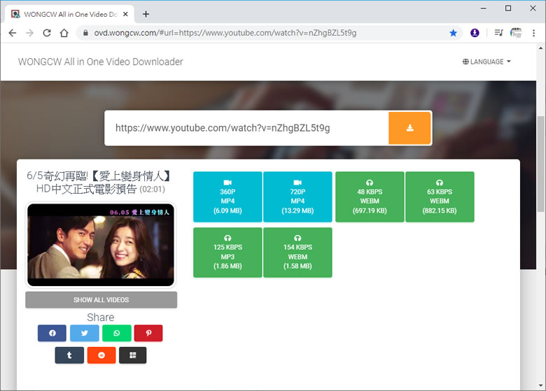 首頁線上工具上傳下載 WONGCW All in One Video Downloader 包含 Instagram 在內的共 27個網站影片下載免費線上工具 現在很多網站都有提供免費的影音可供觀看,像是大家熟悉的 YouTube、FaceBook、Dailymotion、Instagram、Tiktok ..等,要下載這些網站內的影片,網路上有很多免費的服務可供應用,但,絕大多數都有廣告或誘導點擊的跳轉頁面,且很難保證不含惡意程式在內,WONGCW All in One Video Downloader 這個線上網站,可支援除上述網站之外,還包含有 9gag、Bandcamp、Blogger、Break、Buzzfeed、Espn、Flickr、Imdb、Imgur、Izlesene、Likee、Liveleak、Mashable、Odnoklassniki、Pinterest、Soundcloud、Ted、Tumblr、Twitch、Twitter、Vimeo、Vk 總共 27個網站的影片下載,檔案格式包含 MP3、MP4、 M4A、WEBM等,重點來了,該網站沒有上述所說的廣告或誘導點擊跳轉頁面,貼上影片網址,點擊所要的檔案格式就可下載。 🔔 不錯過任何精彩! 立即訂閱我們的 LINE 官方帳號 每次發佈新文章時,您將會第一時間收到本站文章連結通知,輕鬆掌握最新資訊! 使用 LINE 追蹤文章更新 §相關文章,還可以參閱:M3U8 Player:本地瀏覽器處理,播放、下載、轉 MP4 一站免費完成getM3U8 免費線上工具:輕鬆下載 M3U8 串流影片並轉檔 MP4SnapWC 免費影片下載器:一鍵搞定 YT、IG、FB、抖音等 10,000+ 平台影片、音訊、圖片需要分享圖片連結?試試 PiXhost 免費圖床服務P2PFileShare 線上 P2P 傳檔免費工具,免安裝無檔案大小限制直接瀏覽器傳輸 如何使用 WONGCW All in One Video Downloader 下載 YouTube 影片? 1.使用瀏覽器進入 WONGCW All in One Video Downloader 網站,可先來看所支援下載的網站。 2.接下來我們以 YouTube 為例,貼上影片網址,點擊其右側的確定圖示按鈕,就可得到該影片所支援下載的影片格式。 3.點擊要下載的檔案格式,雖然會跳出新頁面,但無內容,開始下載後,該頁面會自動關閉。 WONGCW All in One Video Downloader網站網址:https://ovd.wongcw.com/