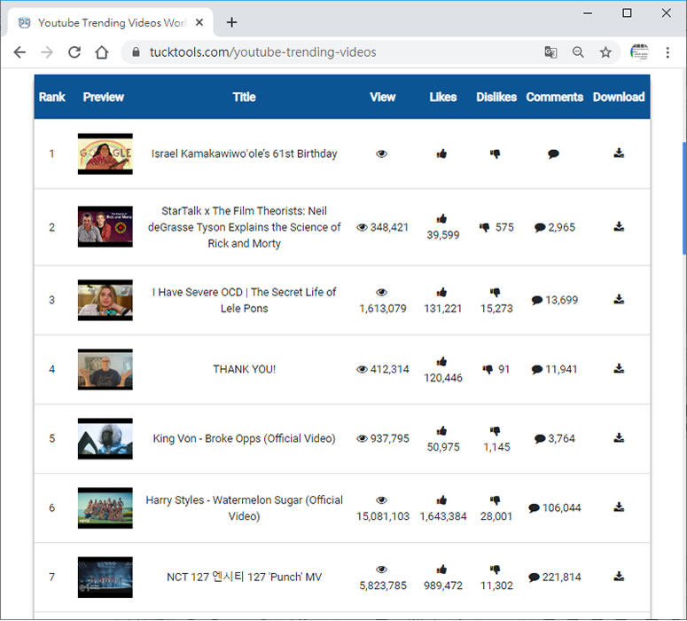 首頁線上工具上傳下載 Youtube Trending Videos 世界各地 YouTube 熱門影片搜尋與下載 YouTube 內的影片包羅萬象,而各個國家地區也會因風俗民情、社會氛圍的不一樣,而產生獨有的熱門趨勢影片,想要知道全世界或某個國家都在 YouTube 上看什麼影片,最簡單的方式就是利用 tucktools 網站旗下的 Youtube Trending Videos 這個免費的功能來搜尋,預設是以全球觀看次數最多的影片來呈現,用戶也可以輸入國家的英文名稱來搜尋,看看當地人都在 YouTube 上看什麼影片,另外該網站還對列出的影片貼心設計下載的功能,免去想下載 YouTube 影片,還需另外找下載工具的困擾。 🔔 不錯過任何精彩! 立即訂閱我們的 LINE 官方帳號 每次發佈新文章時,您將會第一時間收到本站文章連結通知,輕鬆掌握最新資訊! 使用 LINE 追蹤文章更新 §相關文章,還可以參閱:M3U8 Player:本地瀏覽器處理,播放、下載、轉 MP4 一站免費完成getM3U8 免費線上工具:輕鬆下載 M3U8 串流影片並轉檔 MP4SnapWC 免費影片下載器:一鍵搞定 YT、IG、FB、抖音等 10,000+ 平台影片、音訊、圖片需要分享圖片連結?試試 PiXhost 免費圖床服務P2PFileShare 線上 P2P 傳檔免費工具,免安裝無檔案大小限制直接瀏覽器傳輸 如何使用 Youtube Trending Videos 搜尋並下載各地熱門影片? 1.使用瀏覽器進入 Youtube Trending Videos 網站,預設會列出 YouTube 在全球最熱門的 25個影片。 2.我們可以在搜尋框中,輸入要找的國家或地區的英文名稱,例如 India 或 Taiwan。 3.每個熱門影片的最右側都有個箭頭向下的圖示按鈕,點擊後,便可開始下載程序。 Youtube Trending Videos網站網址:https://www.tucktools.com/youtube-trending-videos