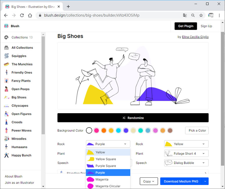 首頁免費素材圖像圖示 Blush 可變換構圖中的每一成分來創建自己的插圖 Blush 是一個蒐集由世界各地藝術家所帶來插圖,每幅插圖已經由網站定義出可更換的部件,用戶只須按照自己的喜好,就可以自行變換插圖中的部件,例如顏色、場景、人物姿勢、人物配件等,不同風格的圖片,各自有各自的可以變換部件,完成的圖片,可免費下載成 PNG 圖檔,個人與商業均可自行運用,也無須註明出處。 🔔 不錯過任何精彩! 立即訂閱我們的 LINE 官方帳號 每次發佈新文章時,您將會第一時間收到本站文章連結通知,輕鬆掌握最新資訊! 使用 LINE 追蹤文章更新 §相關文章,還可以參閱:精心打造的等距美學:Isocons 免費圖示資源庫,CC BY 4.0 授權Map-It:日本地圖素材的免費寶庫,從全國到市町村一網打盡PICaboo! 日系可愛免費向量圖素材庫:設計師必收的創作寶庫GAHAG:日本免費圖庫新選擇,結合アハ體驗互動遊戲的創意素材平台illust STAMPO:日式風格的免費插圖素材網站 如何使用 Blush 自行變換插圖中的部件? 1.使用瀏覽器進入 Blush 網站,用戶可根據左側的插圖風格分類來選擇。 2.不同插圖有不同可變換的部件。 3.用戶可在其定義的範圍,自行變換各個部件。 4.完成後,就可以按[ Download Small PNG ]來下載,或按其旁的向下箭頭圖示按鈕,來選擇格式,格式前有鎖頭按鈕圖示的圖片格式是需要付費的,用戶可以自行評估。 Blush網站網址:https://blush.design/