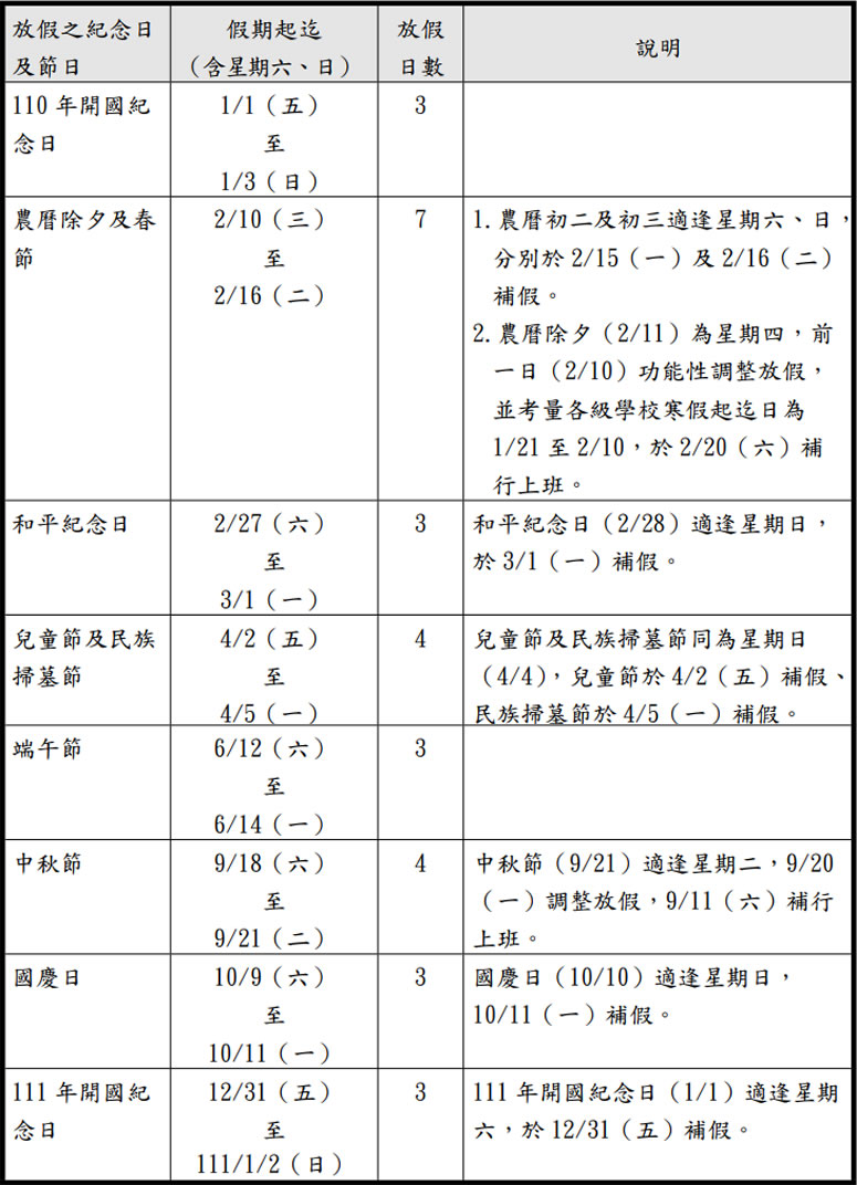 首頁線上工具生活資訊 行政院人事行政總處 - 中華民國 110年(西元 2021年)政府行政機關辦公日曆表下載 行政院人事行政總處已公布中華民國 110年政府行政機關辦公日曆表,如果需要計畫明年度的旅遊、出差等行事計畫,可參考中華民國 110年政府行政機關辦公日曆表,來制定自身的行事曆,110年總放假日數共 116天(比 109年多一天),其中春節連假 7天、開國紀念日(3日)、228和平紀念日(3日)、兒童節及民族掃墓節(4日)、端午節(3日)、中秋節(4日)、國慶日(3日)及 111年開國紀念日(3日),以下整理 8個連續假期(含 111年開國紀念日)及 2個補行上班日期。 🔔 不錯過任何精彩! 立即訂閱我們的 LINE 官方帳號 每次發佈新文章時,您將會第一時間收到本站文章連結通知,輕鬆掌握最新資訊! 使用 LINE 追蹤文章更新 §相關文章,還可以參閱:Apple Music 台灣新用戶優惠:6個月免費暢聽,領取方式與限制一次看!2026春節追劇清單!Netflix 2月必看攻略:燒腦推理、火爆動作片,陪你從初一爽追到開工!459 萬人搶 60 萬份!運動幣中獎號碼公布,快查你的身分證尾數都馬一起GO!LINE GO新年優惠最高拿$800優惠券,還有一個月乘車金等你抽過年搭高鐵自由座要排多久?看LINE就知道 台灣高鐵×LINE TODAY推出春節限定燈號預估服務 中華民國 110年政府行政機關辦公日曆表 1.行政院人事行政總處 - 中華民國110年(西元2021年)政府行政機關辦公日曆表。 2.連續假期一覽表。 中華民國 110年政府行政機關辦公日曆表下載網站網址:https://www.dgpa.gov.tw/information?uid=82&pid=10172相關網址: Excel 按我下載 .PDF 按我下載 .odt 按我下載 紀念日及節日連續假期一覽表下載: .docx 按我下載 .PDF 按我下載 .odt 按我下載