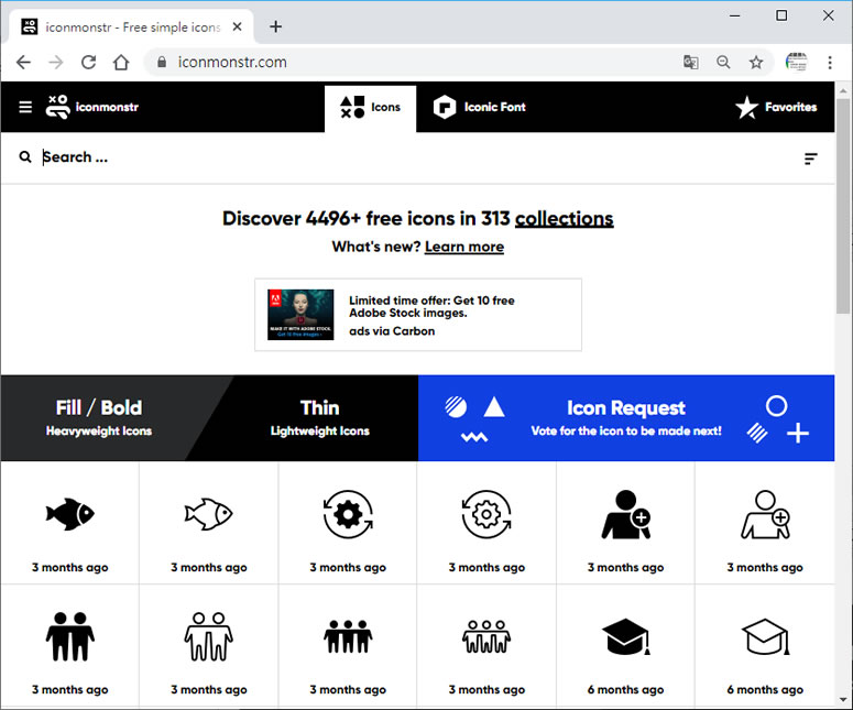 1.使用瀏覽器進入 iconmonstr 網站,可以選用關鍵字來搜尋或是點擊[ collections ]利用主題分類來搜尋,下方的[ Fill/Bold ]及[ Thin ]則可篩選(不分主題)出填滿或僅線條的圖示。