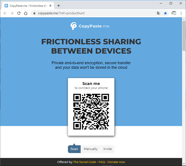 移動設備要與電腦互相傳送數據,常見的方式就是透過藍芽或是在兩個設備之間,安裝相同的 APP,前者適合傳送檔案,後者會讓用戶覺得很麻煩,難道就沒有更合適的解決方案嗎?CopyPaste.me 這個網站免費提供只要透過設備之間都有的瀏覽器就可以互相傳送數據的解決方案,透過掃描 QRCode 或手動輸入驗證碼的方式來認證雙方之間的設備,完成驗證的設備,就可以透過瀏覽器傳送或接收密碼、文字或檔案類型的數據,且為符合資訊安全的要求,傳送的數據在抵達接收端後就會啟用計時器,時間到就會自動銷毀,且整個過程只要一方離開,瀏覽器就會重新回到驗證機制,讓所傳送的數據不因為有外在因素的干擾,而產生洩漏的資訊安全問題。