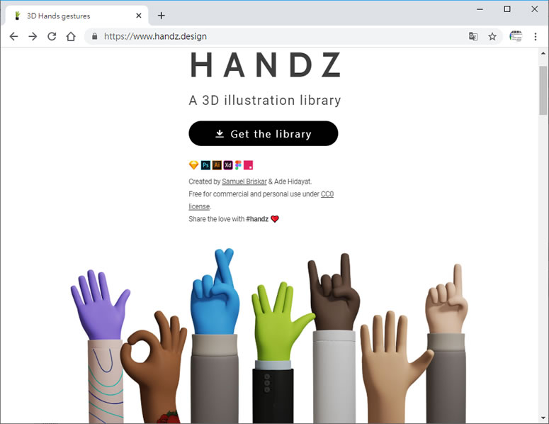首頁免費素材圖像圖示 HANDZ 個人和商用皆可的免費 3D立體手勢圖 手勢圖可以替代一些無法用文字所表達的意境,像是豎起大拇指、握手、OK 或手指等手勢,會根據所處情境之不同,而衍生出不同的解釋,HANDZ 這個網站提供帶有 9種膚色和 3種不同袖子的 12個手勢圖,可由用戶自行搭配出 320種的組合,且提供 Windows 及 MAC OS X 皆可使用 PNG 圖檔,除此之外還提供 .blend 的原始圖檔讓用戶自行創建、修改與組合,網站有特別標示個人及商用皆可免費使用,有缺手勢圖的朋友,趕快收藏吧! 🔔 不錯過任何精彩! 立即訂閱我們的 LINE 官方帳號 每次發佈新文章時,您將會第一時間收到本站文章連結通知,輕鬆掌握最新資訊! 使用 LINE 追蹤文章更新 §相關文章,還可以參閱:精心打造的等距美學:Isocons 免費圖示資源庫,CC BY 4.0 授權Map-It:日本地圖素材的免費寶庫,從全國到市町村一網打盡PICaboo! 日系可愛免費向量圖素材庫:設計師必收的創作寶庫GAHAG:日本免費圖庫新選擇,結合アハ體驗互動遊戲的創意素材平台illust STAMPO:日式風格的免費插圖素材網站 如何下載 HANDZ 3D立體手勢圖? 1.使用瀏覽器進入 HANDZ 網站,點擊[ Get the library ]。 2.將下圖紅色框處的價格改為 0後,點擊[ Purchase again ]。 3.輸入電子郵件信箱後,點擊[ 獲取 ]後,陸續出現的註冊頁面皆可略過。 4.解壓縮所下載的檔案,便可得到包含 Windows 及 MAC OS X 在內的圖檔。 HANDZ網站網址:https://www.handz.design/
