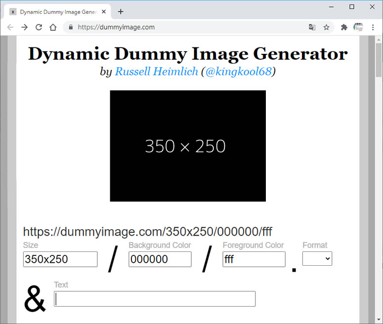 首頁線上工具開發工具 Dynamic Dummy Image Generator 透過網址後接圖片尺寸、顏色就可即時調整佔位圖片大小的產生器 要開發系統或網站,通常都會依照所需流程及功能來構思整個系統架構,如果可以先將系統的操作介面以雛形的方式呈現出來,相形之下就可以對客戶進行良好的溝通,開發人員也不怕所開發的系統會與客戶所描述的落差太大,製作雛形如果需要用到圖片,通常就是隨便找張圖片裁剪成所需的尺寸先放上去,如果要更改就重複做同樣的事情,Dynamic Dummy Image Generator 這個網站可以透過網址的參數來動態調整圖片的寬、高尺寸、背景顏色及文字顏色,圖片格式支援 PNG、GIF 與 JPG,方便雛形的隨時調整與修改,加快與客戶溝通的速度。 🔔 不錯過任何精彩! 立即訂閱我們的 LINE 官方帳號 每次發佈新文章時,您將會第一時間收到本站文章連結通知,輕鬆掌握最新資訊! 使用 LINE 追蹤文章更新 §相關文章,還可以參閱:網站效能健檢免費工具!PageTest 多裝置模擬效能分析及由 AI 提出改進建議Regex-Vis 圖解正則表達式的線上工具,可編寫還可驗證Sitemap Generator:線上快速產生符合 SEO 標準的網站地圖,無網址數量限制適用各類型網站網站隱私權政策產生器 Privacy Policy Generator:輸入網站名稱和網址即可輕鬆生成專屬條款Frame0:輕鬆繪製應用程式流程圖、UML 和介面雛形的免費工具,適用於 macOS 與 Windows 如何使用 Dynamic Dummy Image Generator 佔位圖片產生器? 1.使用瀏覽器進入 Dynamic Dummy Image Generator 網站,便可以透過 Size、Background Color、Foreground Color、Format 及 Text 來製作佔位圖片。 2.製作好的圖片無須下載,只需將下圖紅色框線處內的網址複製後,就可以貼到要顯示圖片的位置處。 3.各項參數的調整說明,可參閱其說明及常見的各式圖片尺寸。 Dynamic Dummy Image Generator網站網址:https://dummyimage.com/