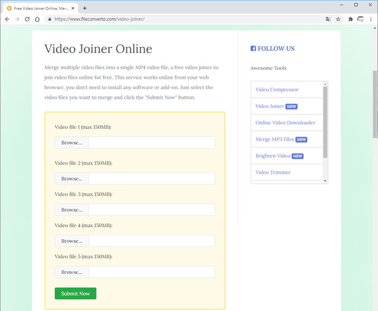 首頁線上工具影音視聽 FileConverto Video Joiner Online 將多個影片合併成一個 MP4 出外旅遊、參加活動的影片,如果要合併成單一影片,該用什麼樣工具最方便呢?Video Joiner Online 是 FileConverto 網站下的一個可將多段影片合併成一個 MP4 影片檔的免費服務,其操作相當簡單,只需將要合併的影片依序上傳( 單一檔案最大限定為 150 MB ),就可以在線上完成影片合併的操作。 🔔 不錯過任何精彩! 立即訂閱我們的 LINE 官方帳號 每次發佈新文章時,您將會第一時間收到本站文章連結通知,輕鬆掌握最新資訊! 使用 LINE 追蹤文章更新 §相關文章,還可以參閱:sound&go 耳機測試工具:免安裝測左右聲道、頻率響應Veo 3.1「材料轉影片」功能升級:支援直式影片與 4K 畫質來了!OpenAI Sora Android 版上線 Google Play,台灣用戶同步開放Google 親授 Veo 3.1 用電影語言與音效設計打造完美 AI 影片Sora Watermarker:一鍵為影片加上 OpenAI Sora 浮水印 如何使用 FileConverto Video Joiner Online 將多個影片檔合併成單個 MP4? 1.使用瀏覽器進入 FileConverto Video Joiner Online 網站,按影片合併順序點擊[ Browse... ]來加入影片檔,完成後,按[ Submit Now ]來上傳。 2.完成上傳就會開始合併程序,用戶只需等候,便可下載已完成合併的 MP4檔案。 FileConverto Video Joiner Online網站網址:https://www.fileconverto.com/video-joiner/