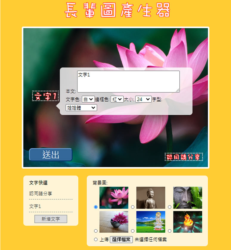 首頁線上工具影像繪圖 可以使用自己的圖片及文字的線上「長輩圖產生器」 不僅僅是年長的人喜歡在一早就 line 早安圖,一般碰到好友生日、喜慶、文宣或需要安慰的事情,往往僅用文字會顯得單調,如果能在文字後加入背景圖,往往能增加渲染效果,「長輩圖產生器」是個線上的免費服務,背景圖片可以使用系統內建,也能使用自己輸入的圖片,文字的部分除了可以自定義外,也可以調整文字大小、顏色字型及圖片邊框顏色,更提供娃娃體、少女文字、竹風體、秀風體、流風體、兒風體、魔風體、康熙字典體、正圓體、標楷體、新細明體等字體,讓文字也能搭配出所需場景,完成後,還可以直接使用 line 或 Facebook 分享。 🔔 不錯過任何精彩! 立即訂閱我們的 LINE 官方帳號 每次發佈新文章時,您將會第一時間收到本站文章連結通知,輕鬆掌握最新資訊! 使用 LINE 追蹤文章更新 §相關文章,還可以參閱:跟著做就會!教你用 ChatGPT 製作具職業形象的漫畫風頭像Put!所見即所得的 AI 提示詞圖庫:讓你看著範例圖,複製就能做出同級作品Google 親自示範:Nano Banana AI 圖像編輯工具的 13 個熱門玩法照片角度不滿意?AI 幫你調整!3D Camera Control 讓舊照片任意變換視角Meta AI 免費帳戶也能用 Midjourney!無限生成 AI 圖片,台灣可用 如何使用 「長輩圖產生器」? 1.使用瀏覽器進入 「長輩圖產生器」 網站,可以自定義圖片內的兩處文字。 2.可以使用系統內建圖片,也可以點擊[ 選擇檔案 ]來上傳自己的圖檔。 3.基本上操作相當簡單,也無須註冊,立即可用,製作完成後的圖檔也可以立即透過 line 或 Facebook 分享。 長輩圖產生器網站網址:https://www.generate.rei.idv.tw/older