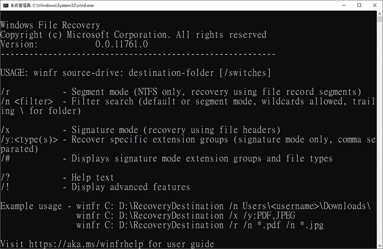 3.Windows File Recovery 開啟後,就有使用說明與範例。