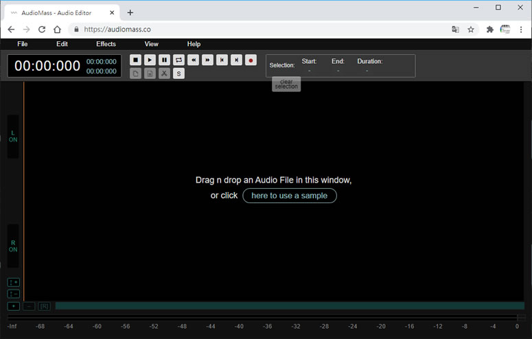 1.使用瀏覽器進入 AudioMass 網站,可以點擊中間 Drag n drop an Audio file in this window, or click 來選擇電腦內的聲音檔案,也可將聲音檔案使用滑鼠選取後,拖拉進上述字樣處,就可上傳,另外,其聲音檔案來源還可以是錄音或是 URL,完成後,會在介面展現其聲音波形,左、右聲道可單獨開啟或關閉,AudioMass 在完成編輯後,可針對全部或選擇的段落進行匯出成 MP3 或 WAV,故在編輯的開始,可預先規畫。。