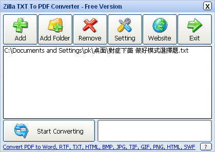 首頁電腦軟體檔案管理 Zilla TXT To PDF Converte 將文字檔轉換成 PDF 檔案格式(免安裝) Zilla TXT To PDF Converte 是一套可將文字檔案轉換成 PDF 的免費軟體,使用上非常簡單,程式也不大且免安裝。 🔔 不錯過任何精彩! 立即訂閱我們的 LINE 官方帳號 每次發佈新文章時,您將會第一時間收到本站文章連結通知,輕鬆掌握最新資訊! 使用 LINE 追蹤文章更新 §相關文章,還可以參閱:檔案好多重複怎麼辦?免費 dupeGuru 幫你一鍵清出電腦空間[ 免費使用 ]PDFgear 整合各種 PDF 工具,具格式轉換、編輯、合併或拆分等功能7-Zip 檔案壓縮與解壓縮免費軟體AmoK Exif Sorter 讓照片按拍照日期重新命名並自動分類的免費軟體PDF Unshare 限制 PDF 檔案的讀取有效日期 如何使用 Zilla TXT To PDF Converte? 1.下載免安裝版並解壓縮後,執行[txt2pdf.exe]開啟主介面,點擊[Add]加入文字檔或將文字檔使用滑鼠拖曳到 Zilla TXT To PDF Converte 轉換列表內。 2.點擊[Start Converting]便開始轉換,轉換完成後的 PDF 檔(不過似乎不支援中文字體)。 3.點擊[Setting]後,可進行參數設定,包含轉檔後的存放路徑、關鍵字、作者...等等。 Zilla TXT To PDF Converte版本:1.0語言:英文性質:免費適用:Windows | Mac OS官方網站:http://www.pdfzilla.com/zilla_txt_to_pdf_converter.html下載:免安裝版 按我下載 安裝版 按我下載 MAC版 按我下載
